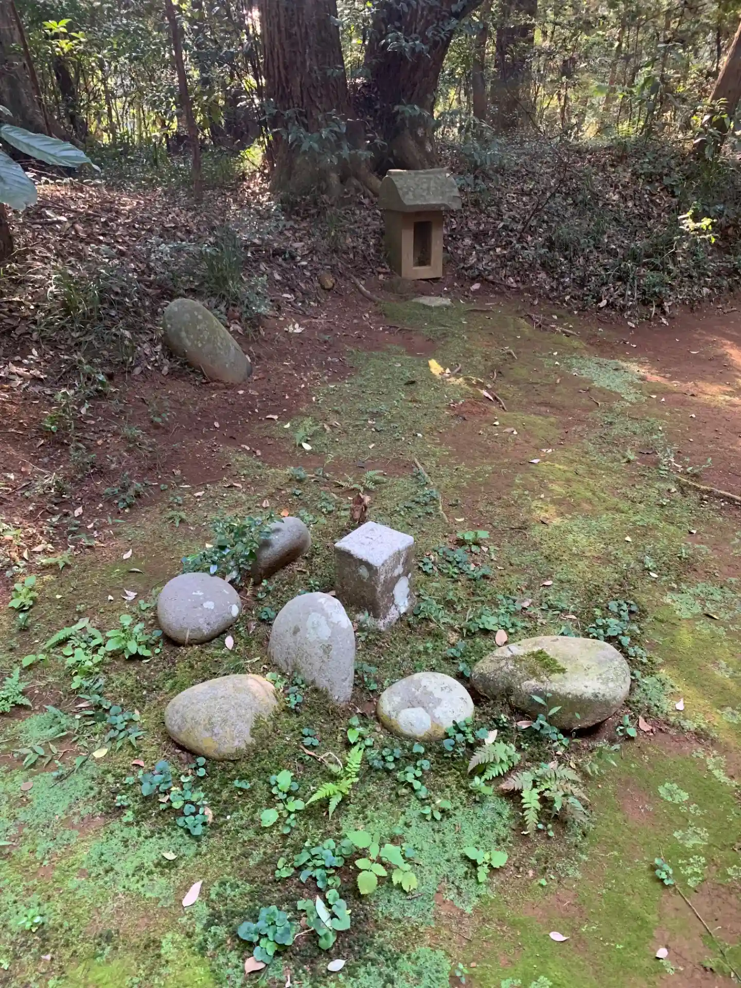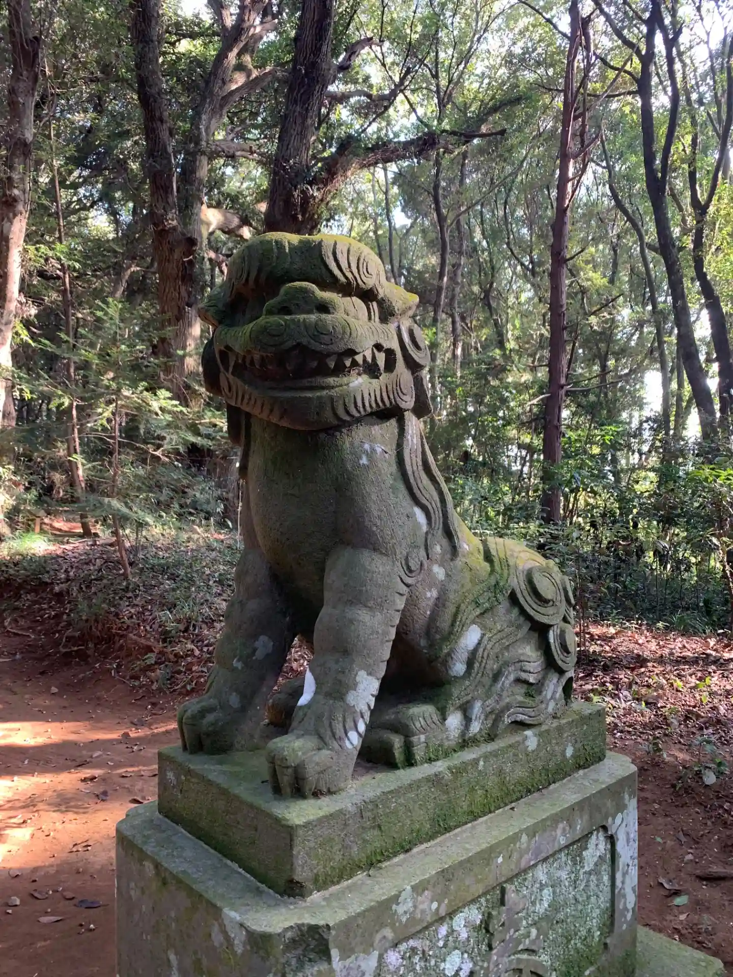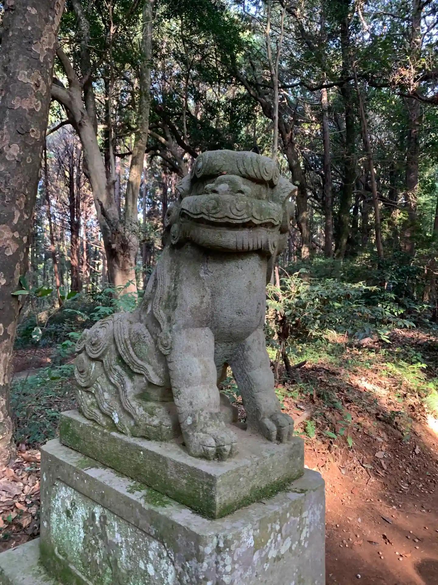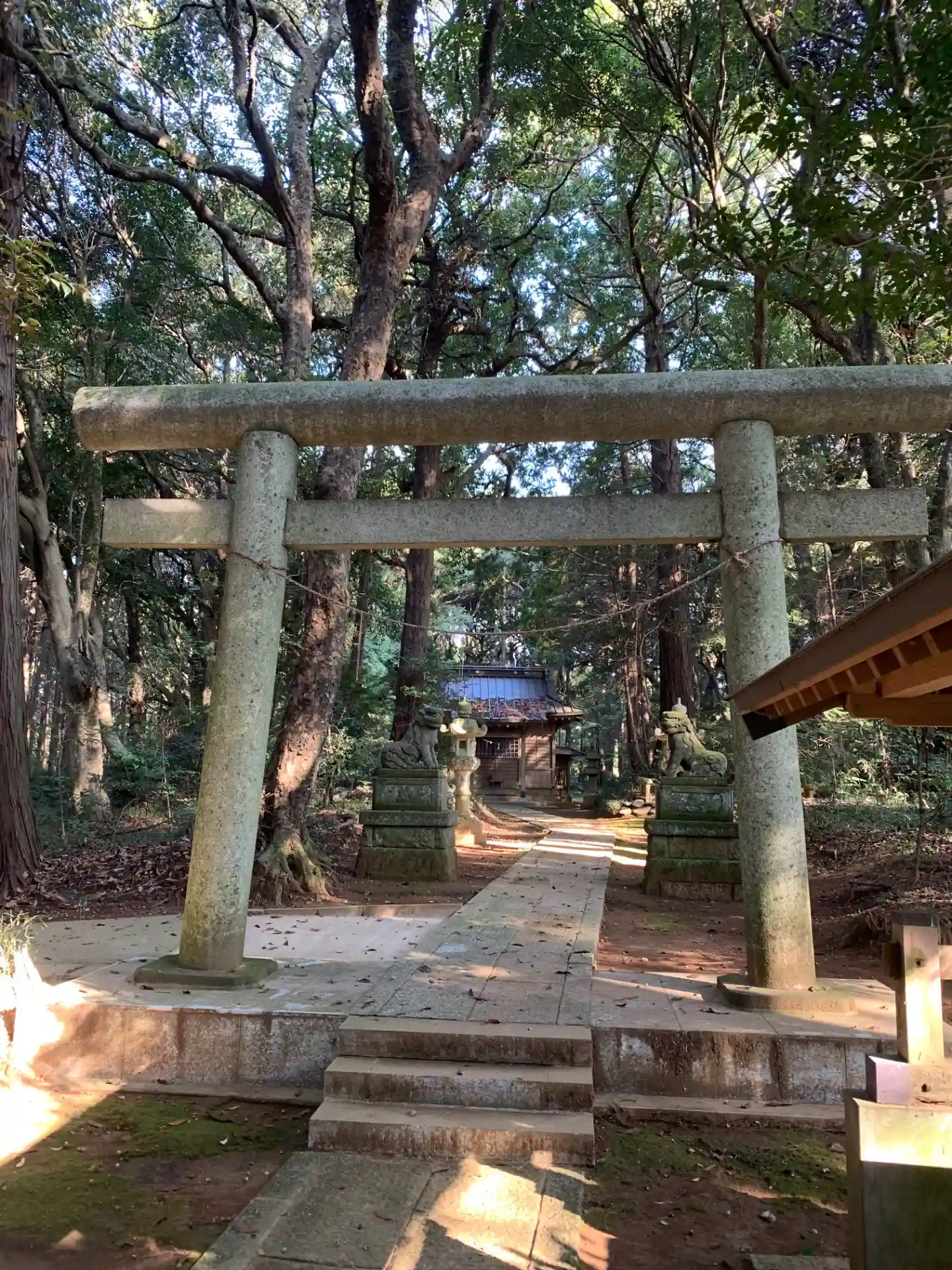 林道の中にある神社。狛犬を備えており、また常夜灯に鹿が彫られるなど石造物が充実していました。