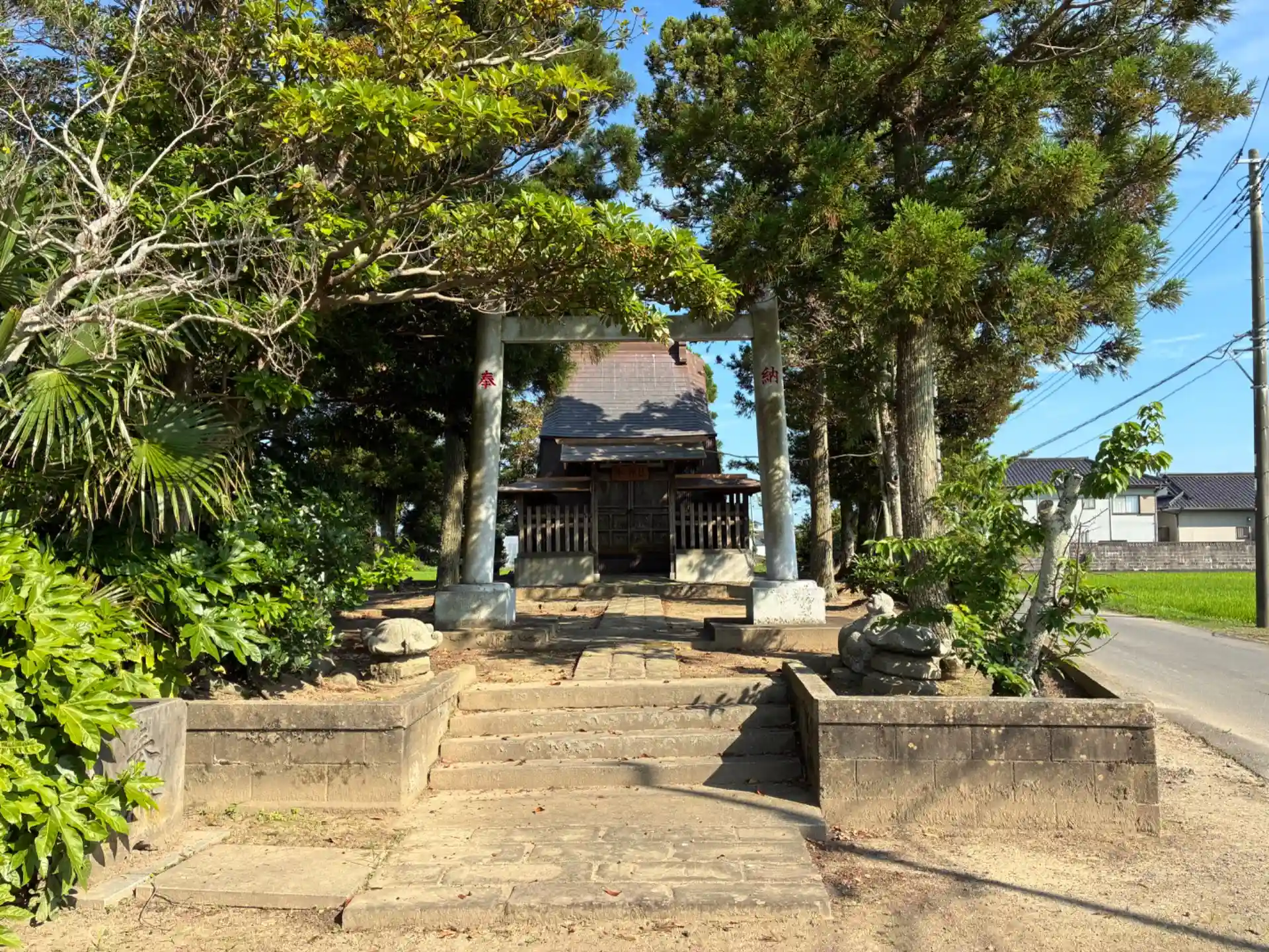 大嶋村の鎮守。神社を避けるように道路が敷いてあります。