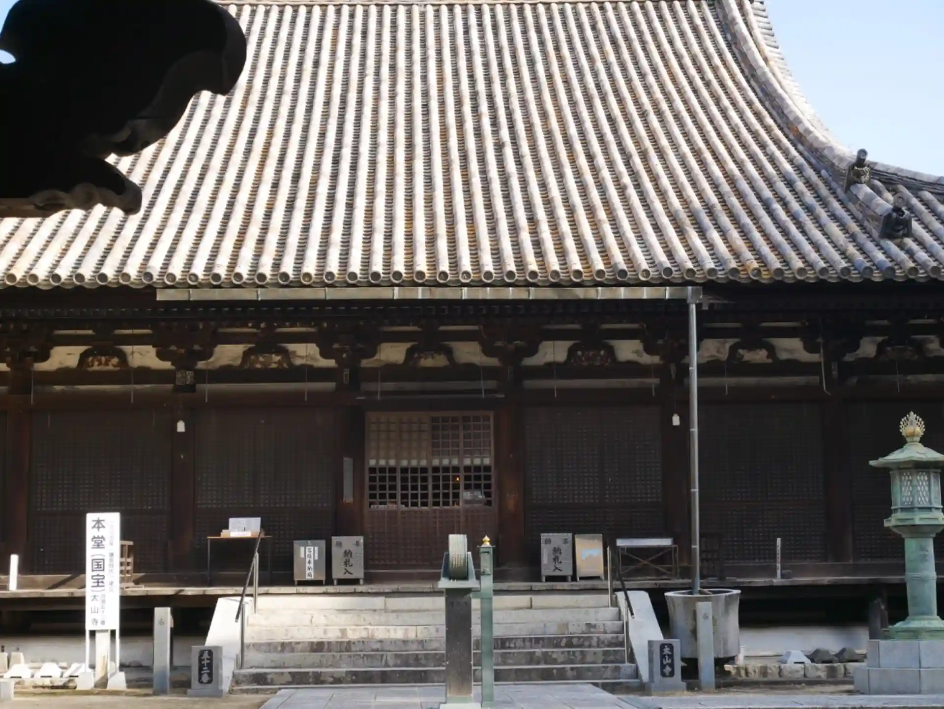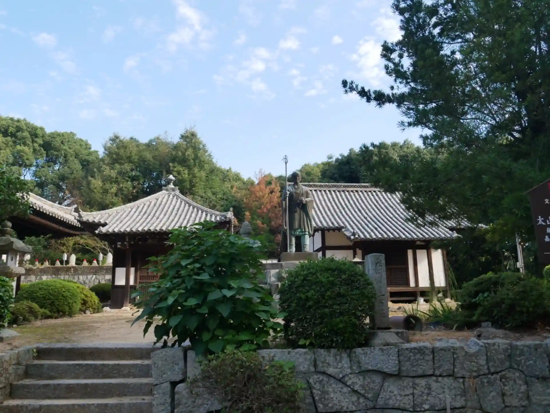 四国八十八ヶ所お遍路第52番札所、瀧雲山護持院太山寺。用明天皇二年、豊後の真野長者が暴風雨に襲われた時観音菩薩に祈願したところ光が差し込み高浜の岸で救われた。光に導かれるとそこには十一面観世音が祀られていた。そこで高浜にお堂を建立した。後に聖武天皇勅願で行基菩薩作が十一面観世音像を彫造、胎内に真野長者が見つけた観音像を納めご本尊とした。