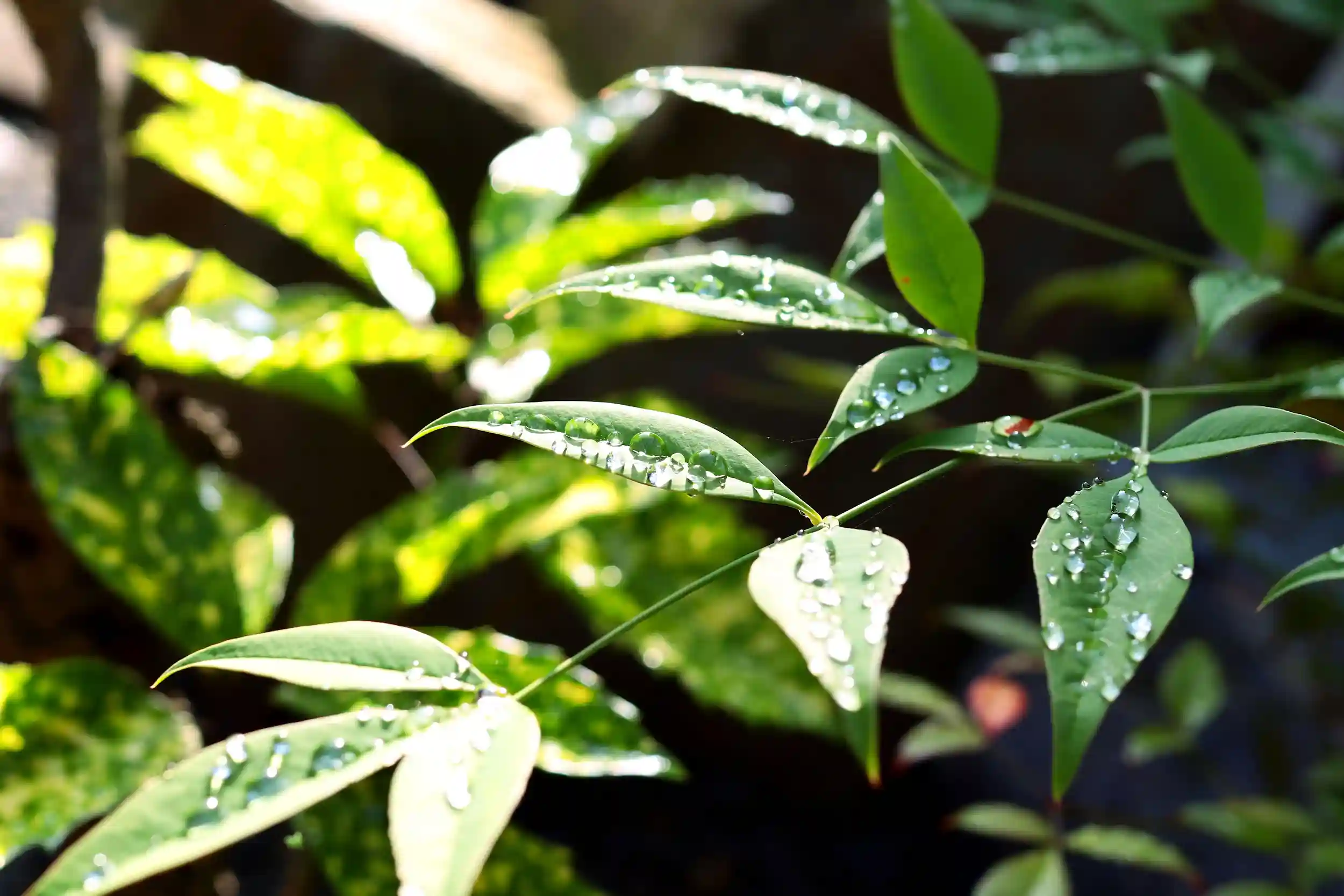 雨上がりの南天の葉についた水滴が太陽に照らされて、美しく輝いていました。