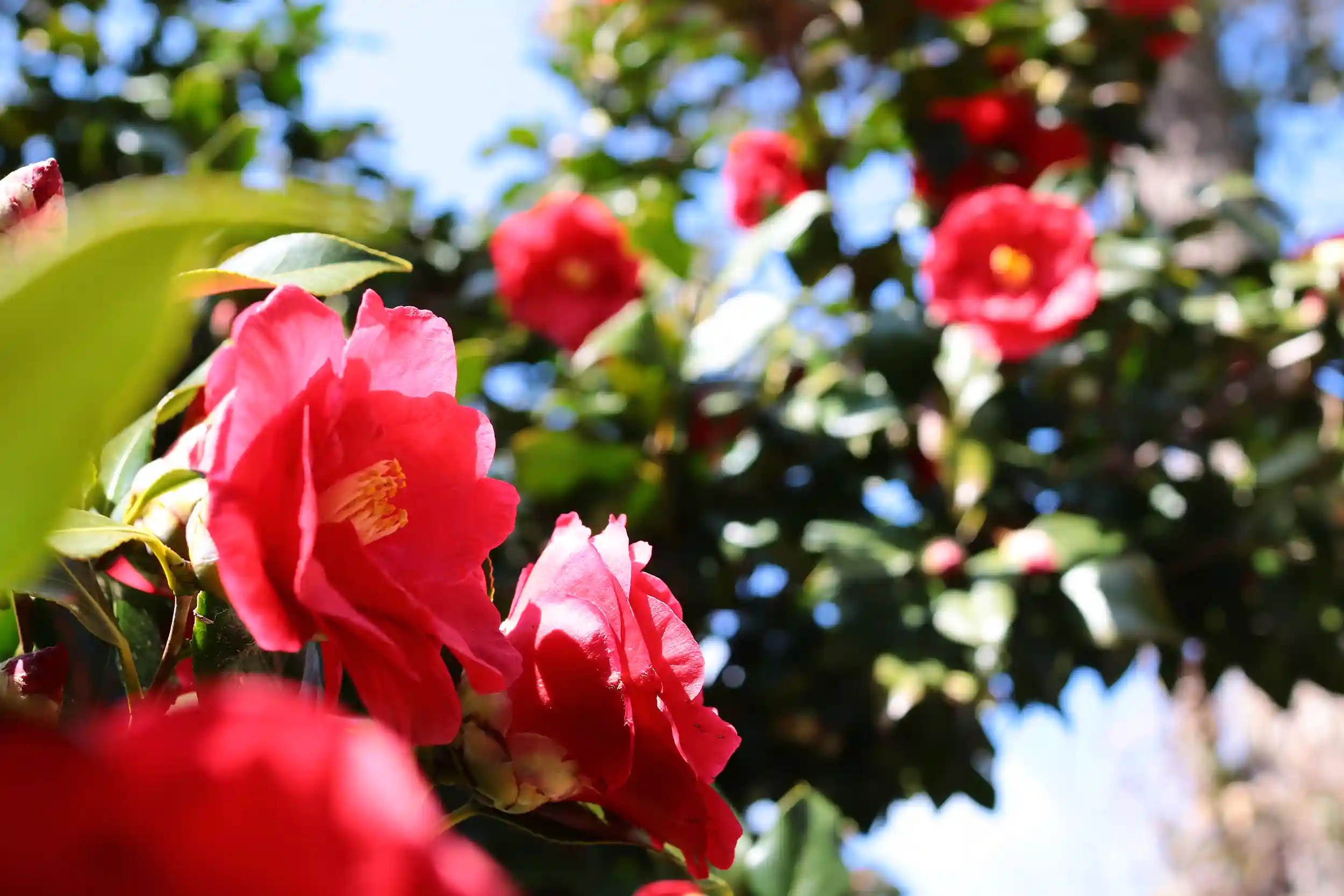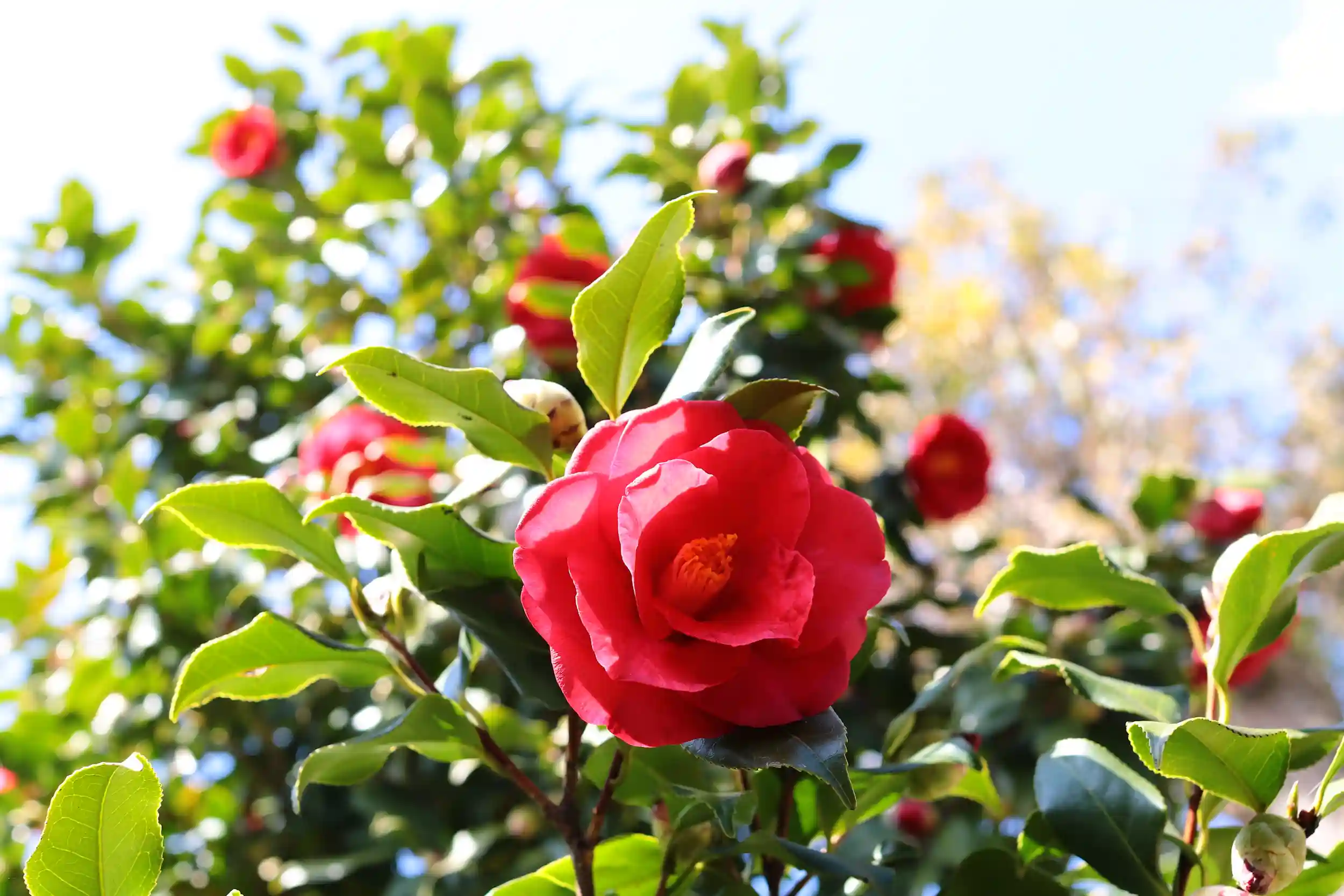 境内の赤椿が美しく咲きそろい、見頃を迎えています。