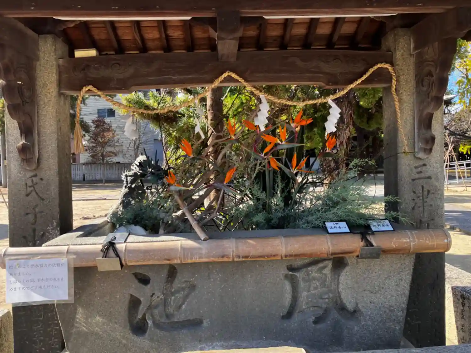 石手川ダムの取水制限が7日から強化されたことを受けて 手水舎の水を止めました。 花手水はそ…