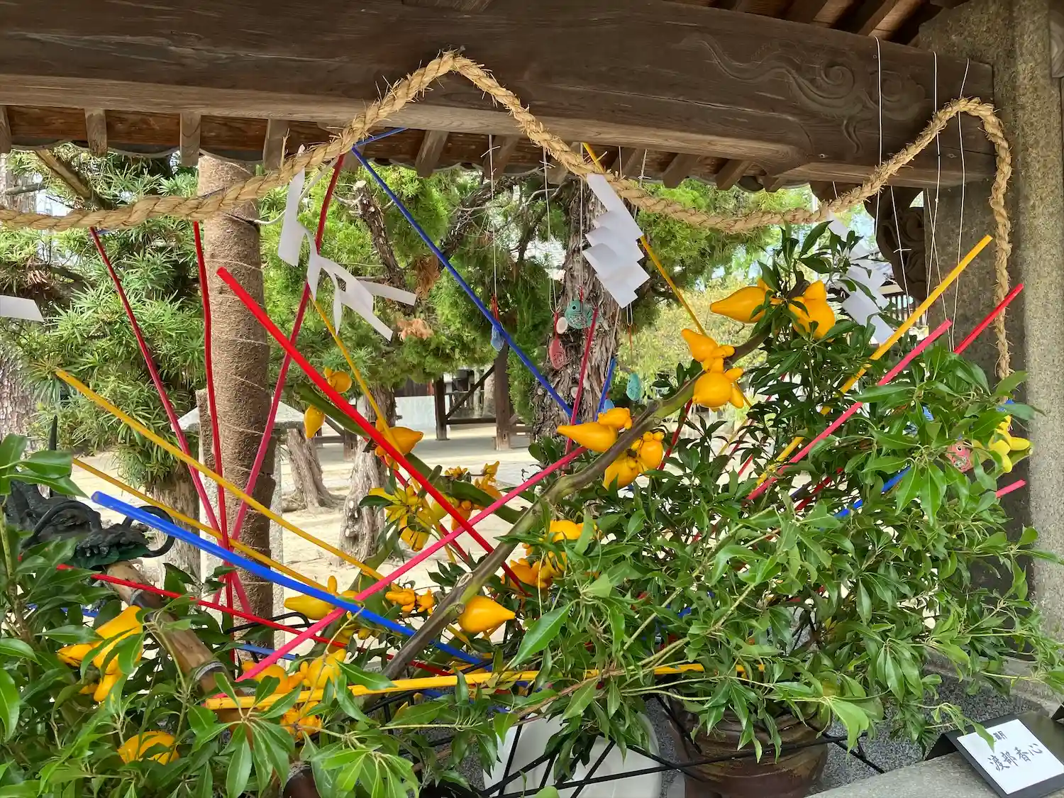 6月30日の夏越祭を前に花手水が入れ替わりました。 竹と金色の水引を使った豪快かつ美しい花手水で…