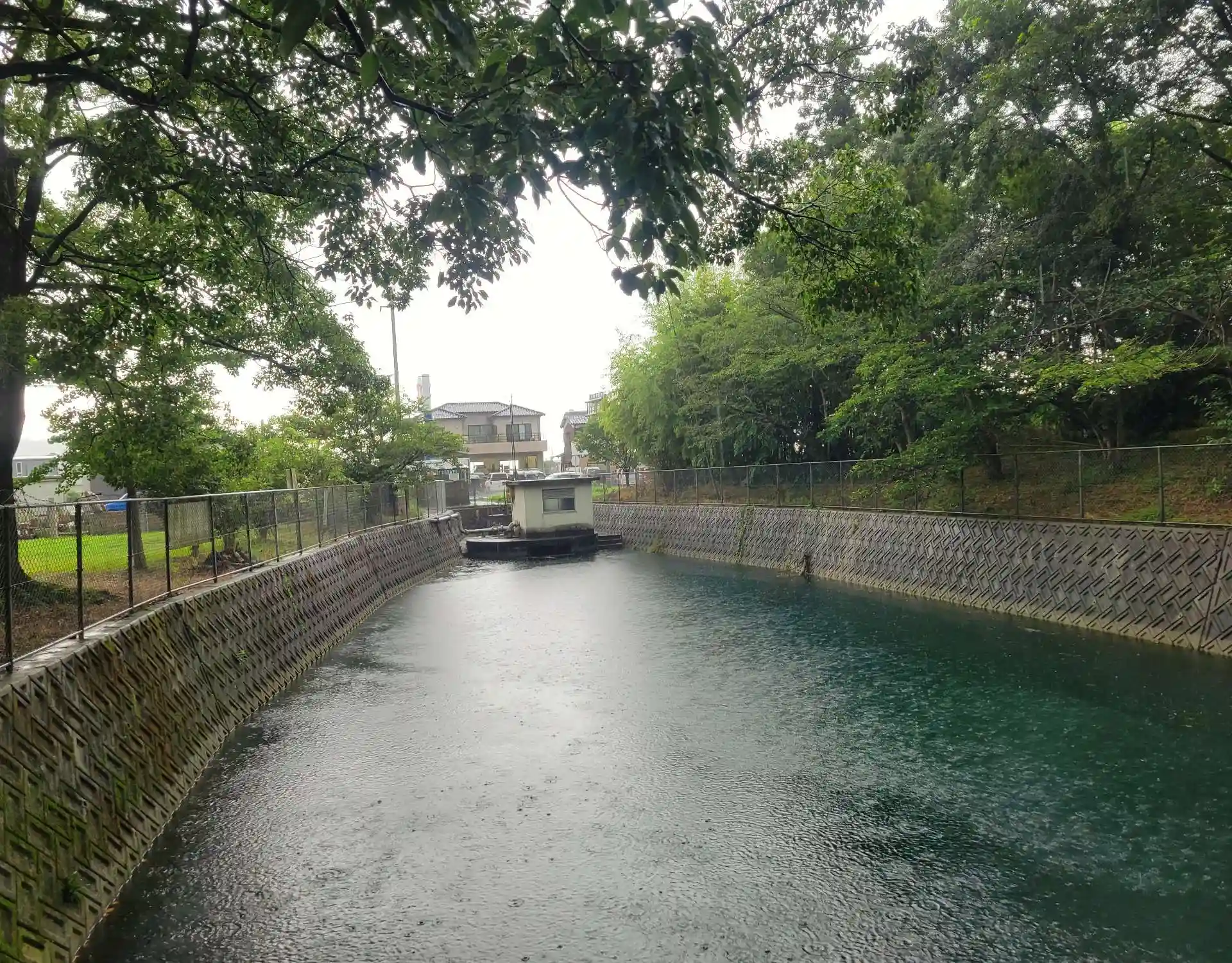 鳥居から社殿までの道のりに綺麗な色の泉があります