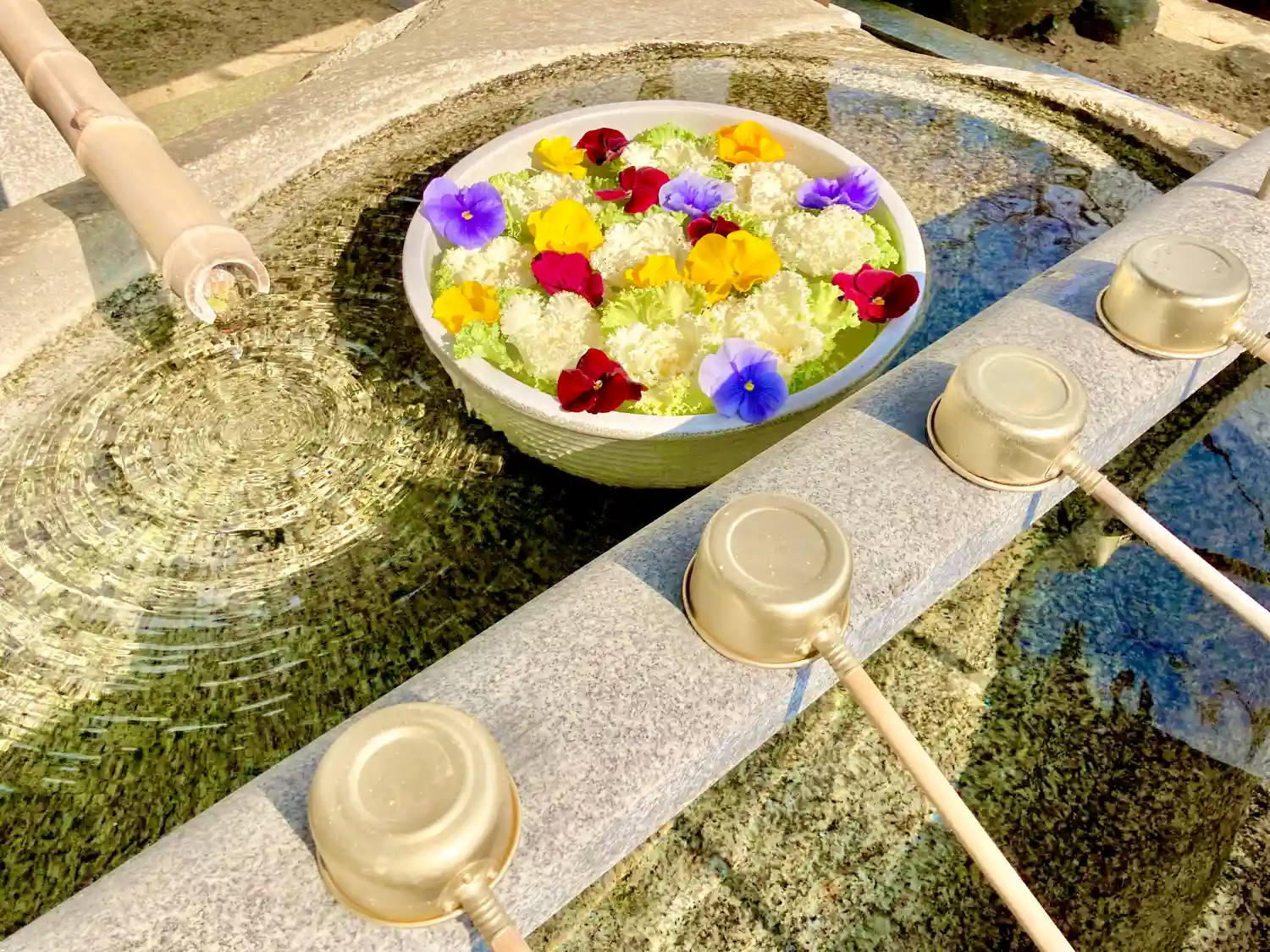 手水鉢に葉牡丹とパンジーを浮かべて花手水にしました。