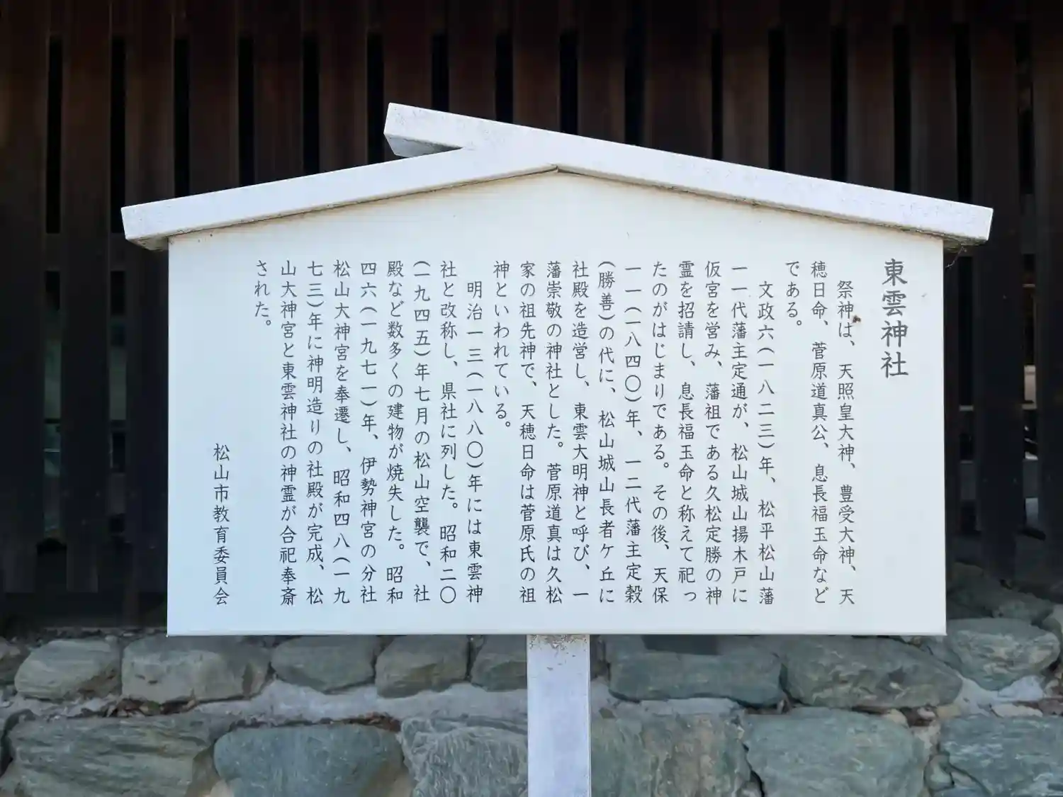 | ご由緒 | 文政6年12月18日、十二代藩主久松定通公が松山城山揚木戸へ仮宮を営み、従四位下左近衛権少将兼隠岐守源朝臣定勝公の神霊を招請し、息長福玉命と称え、天保8年9月28日神祀官領内勾當の長上従二位ト部朝臣良長卿の執奏により、詔勅を以って東雲霊神の霊号を賜り、同年10月1日東雲霊社の社号を賜り、同月7日明神号に進み、同月15日東雲大明神と称し、天保11年3月14日従四位左近衛権少将松平隠岐守源朝臣定穀の代に、神殿を城山長者ヶ丘に建立した。 爾米一藩崇敬の神社であった。 明治13年2月東雲神社と改称し県社に列格。大正12年4月1日息長福玉命の三百年祭を執行、昭和20年7月26日戦災に罹り焼失し、同48年復興した。 |