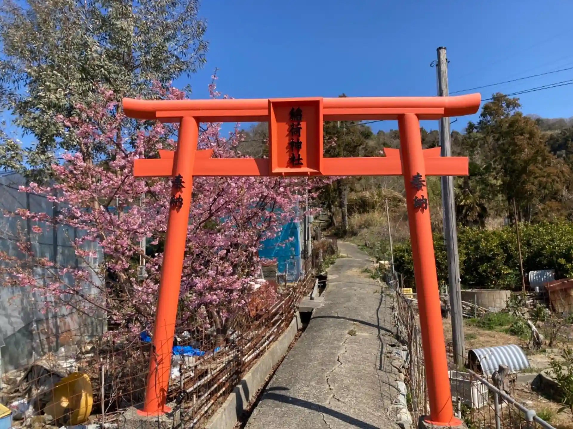 鳥居の横に早咲きの桜が咲いており春だなぁと感じました。