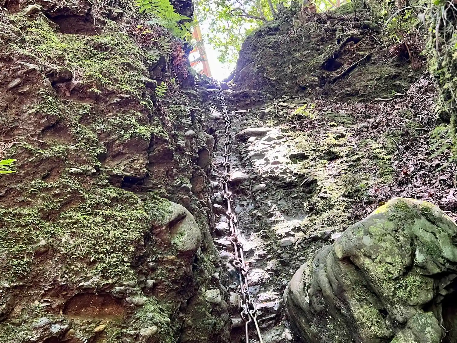 入口の鍵を開けて、襟を正して(折五条袈裟を正して)、入りました。本当に岩の割れ目を鎖を使ってよじ登り、最後は木の梯子を上がるとついに白山妙理菩薩をお祀りする社が現れます。