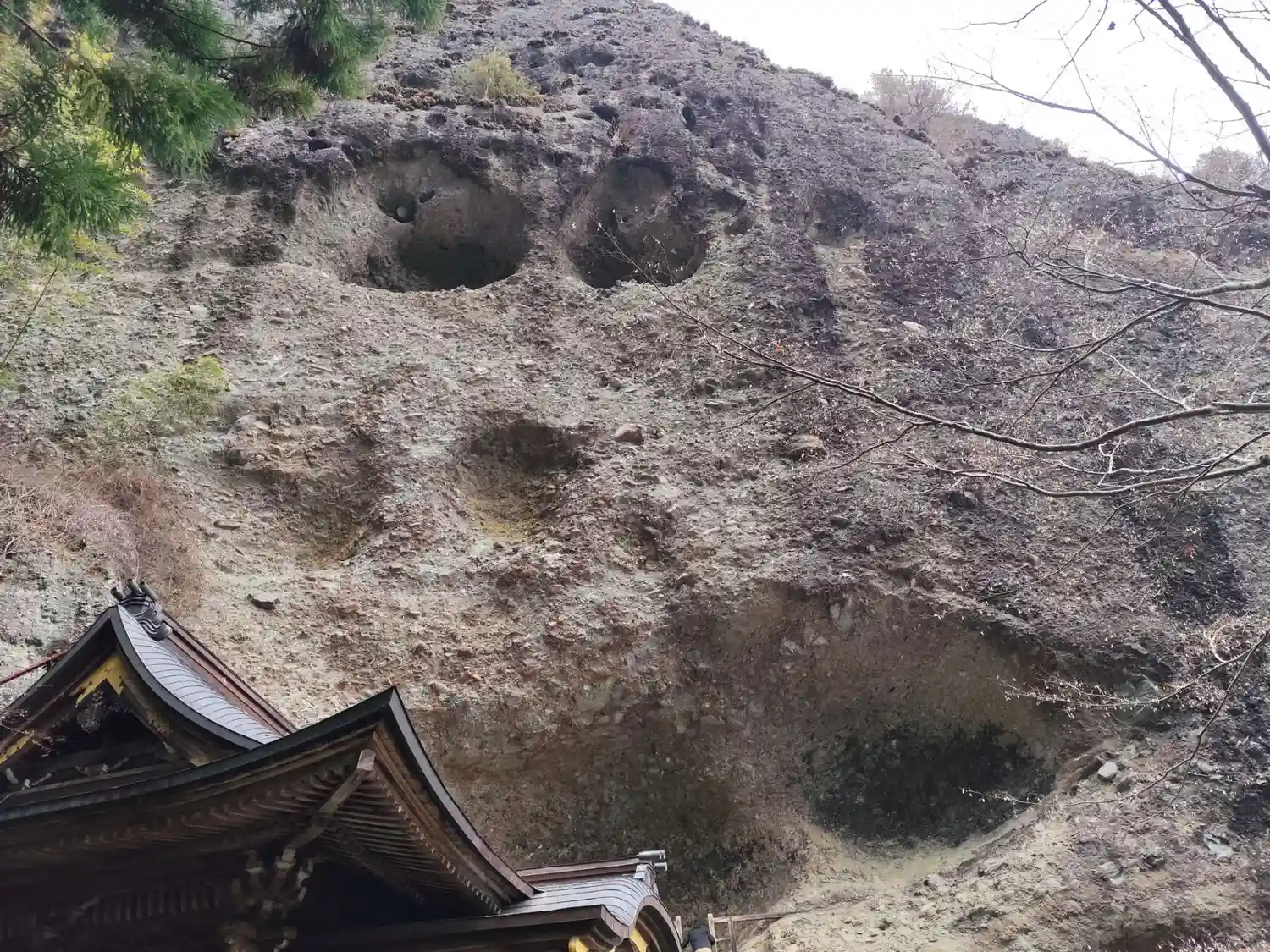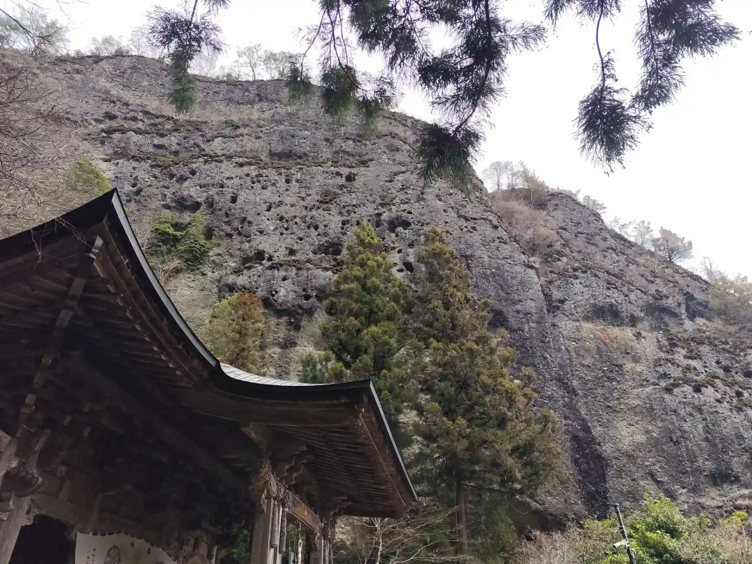 むき出しの断崖を見上げる境内は圧巻!