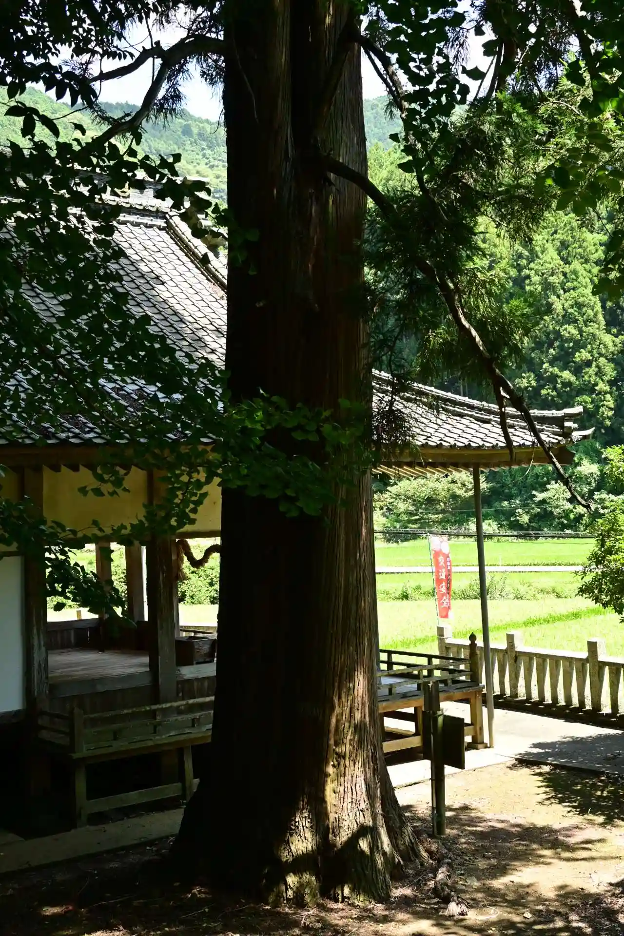 御神橋を渡って、まっすぐな参道の先に鎮守の杜があります。残したい田舎の風景です。
