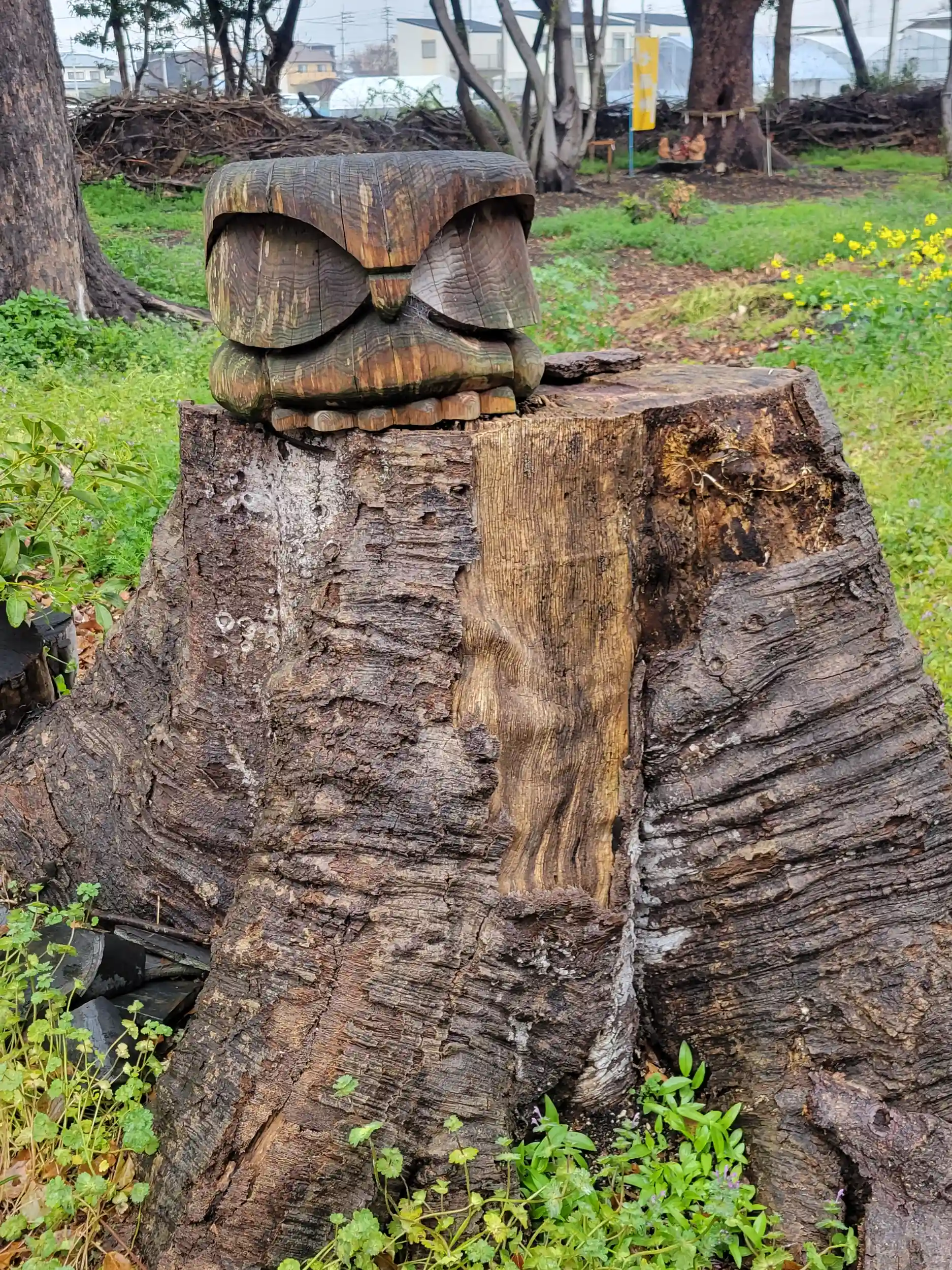 切り株の上に髑髏?のような彫り物