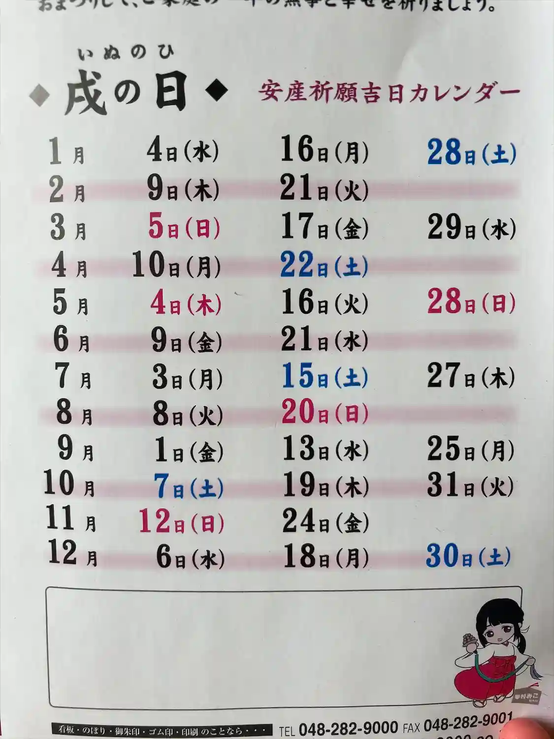 戌の日のカレンダー