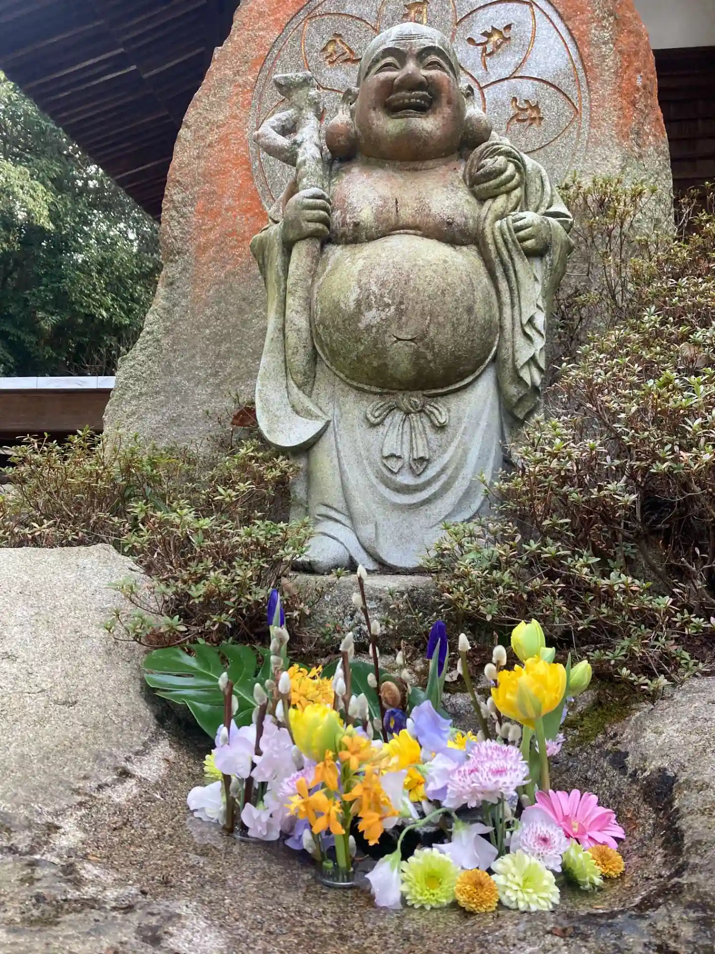 というわけで、布袋さんの花手水にしてみました🌼