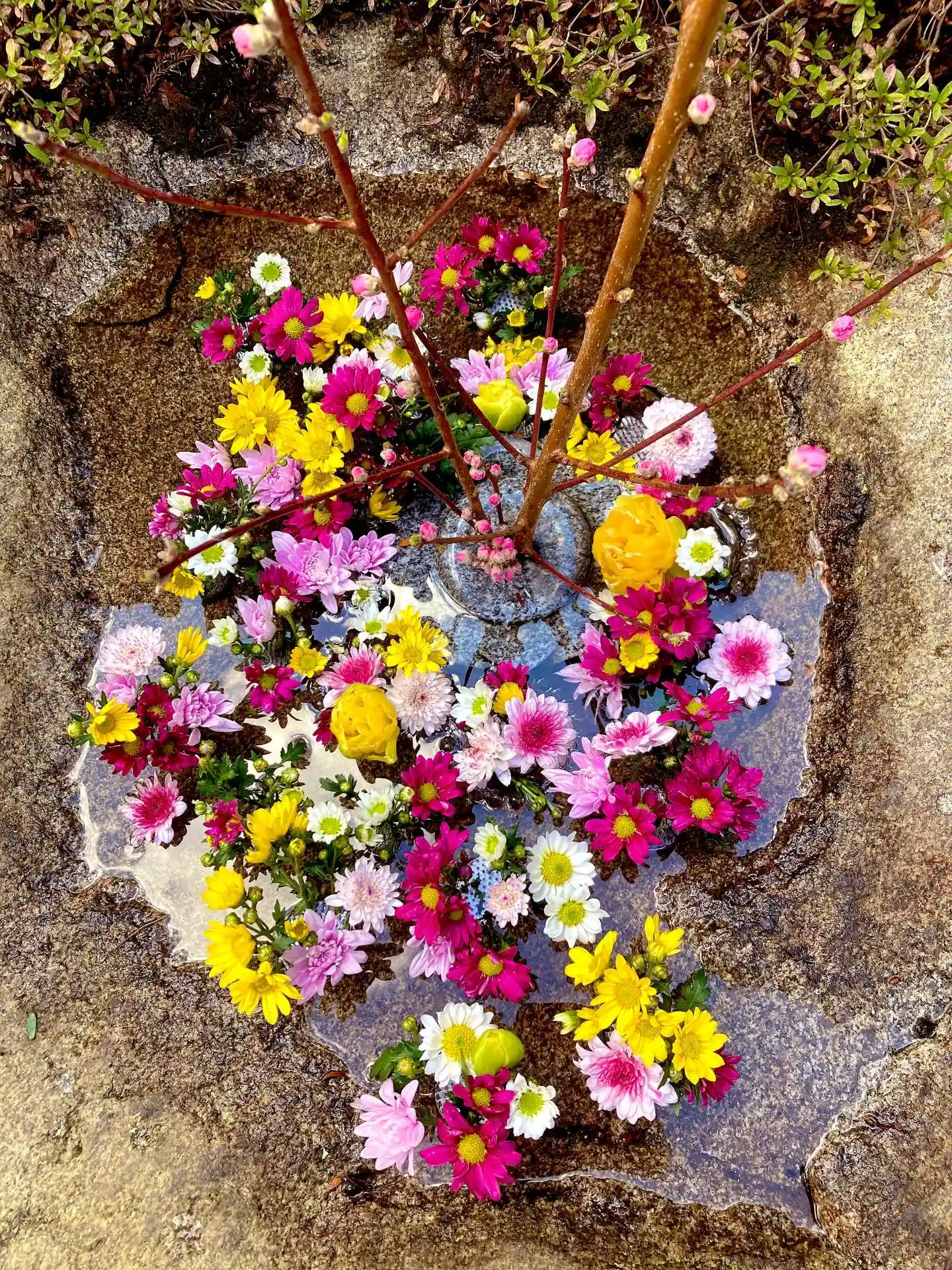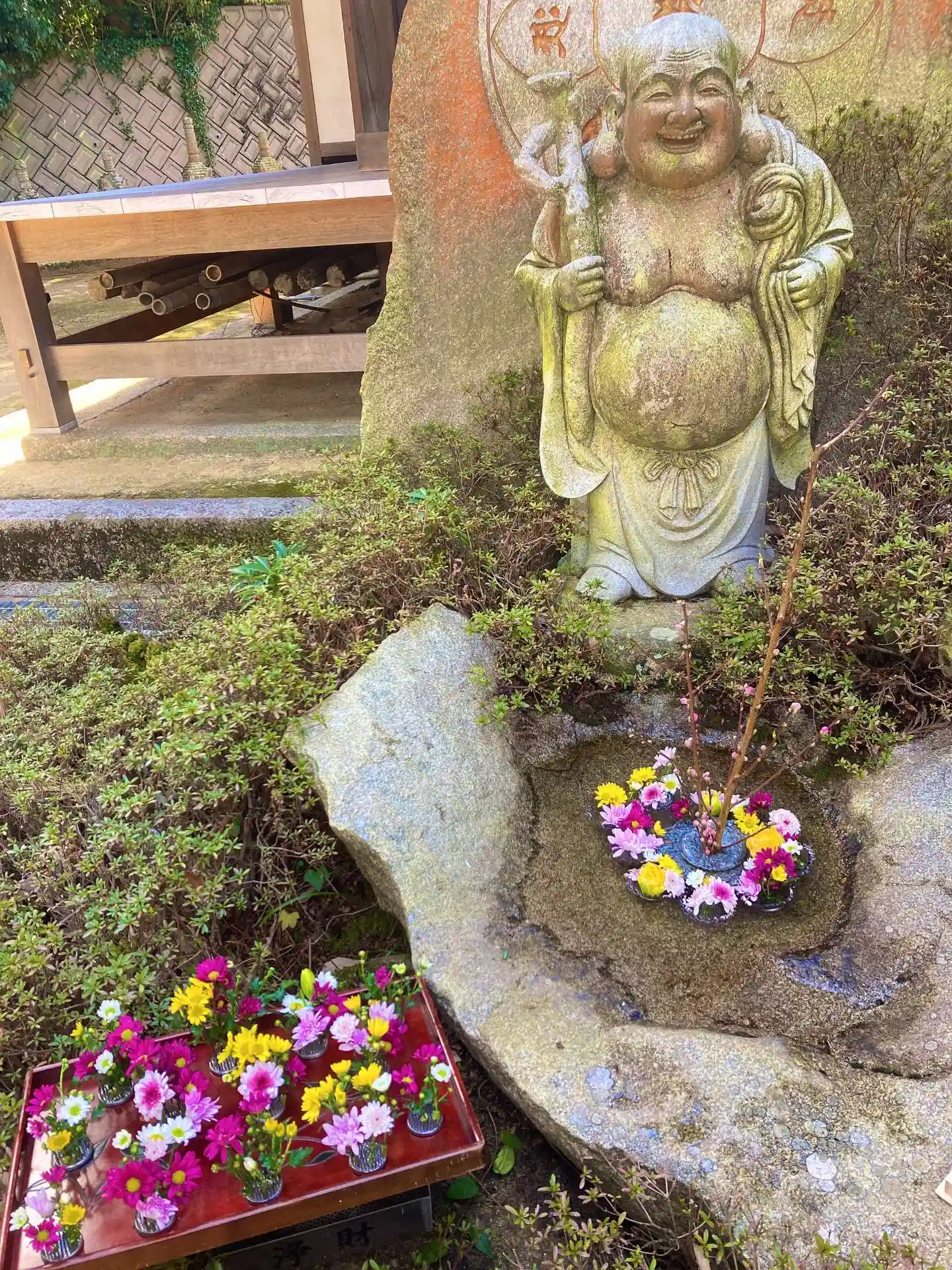雨が止んだので布袋さんの花手水のお花替え🌸
