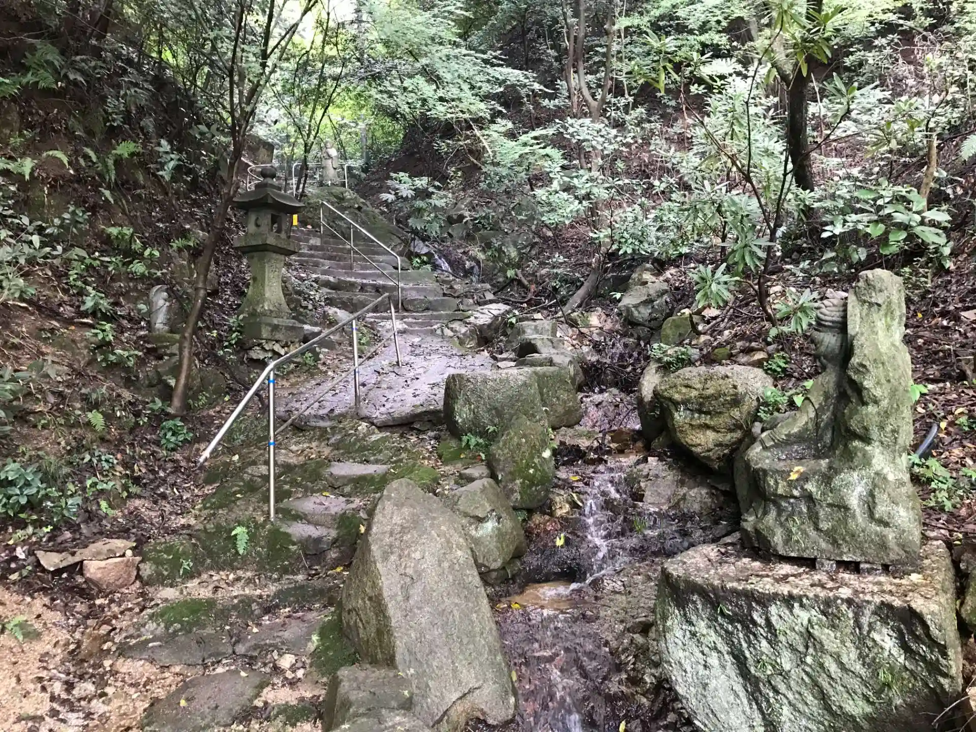 山門裏から本堂へ向かう階段が伸び、石仏が点々と配置されている。