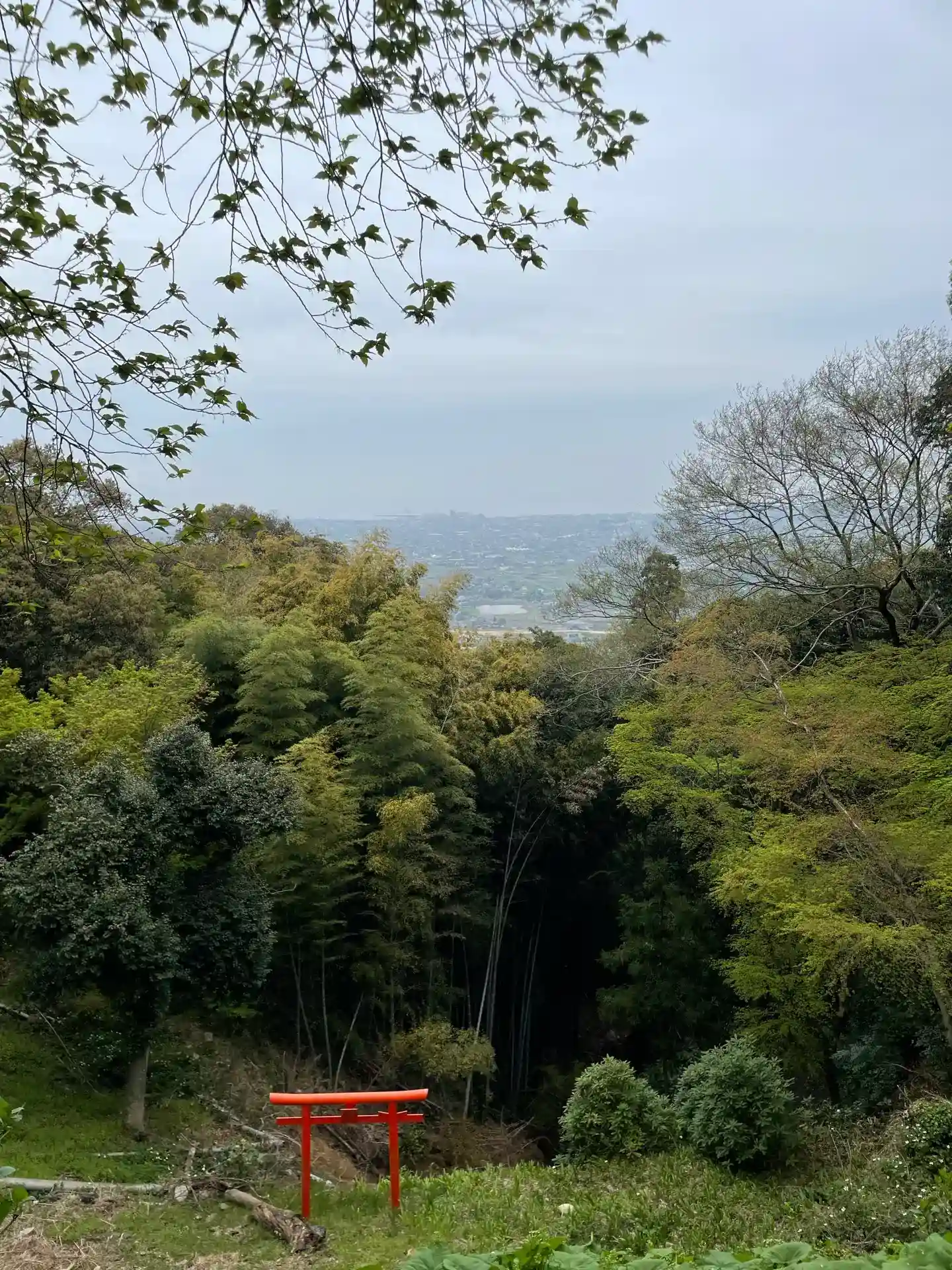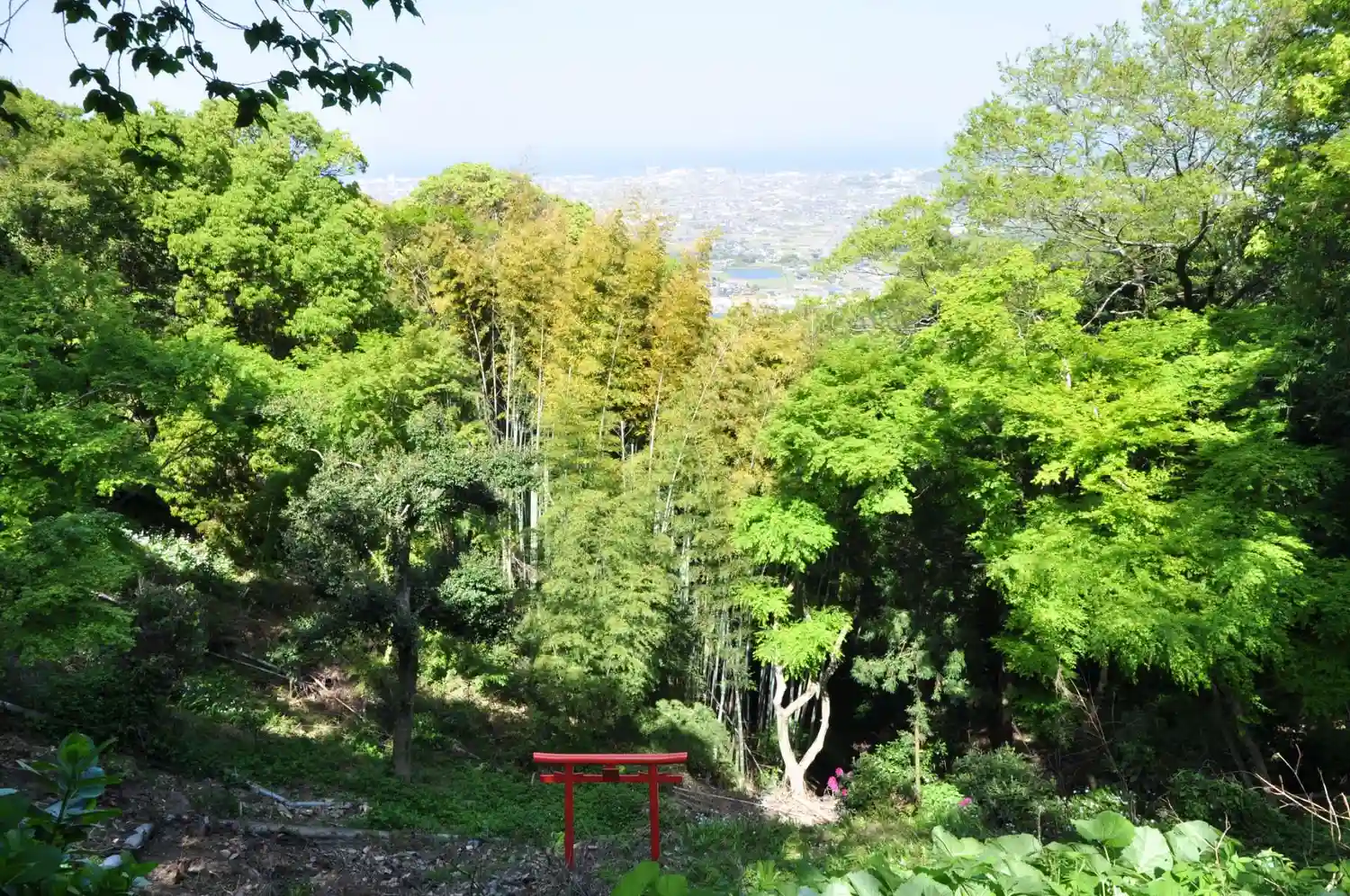 斜面に赤い鳥居が見える。