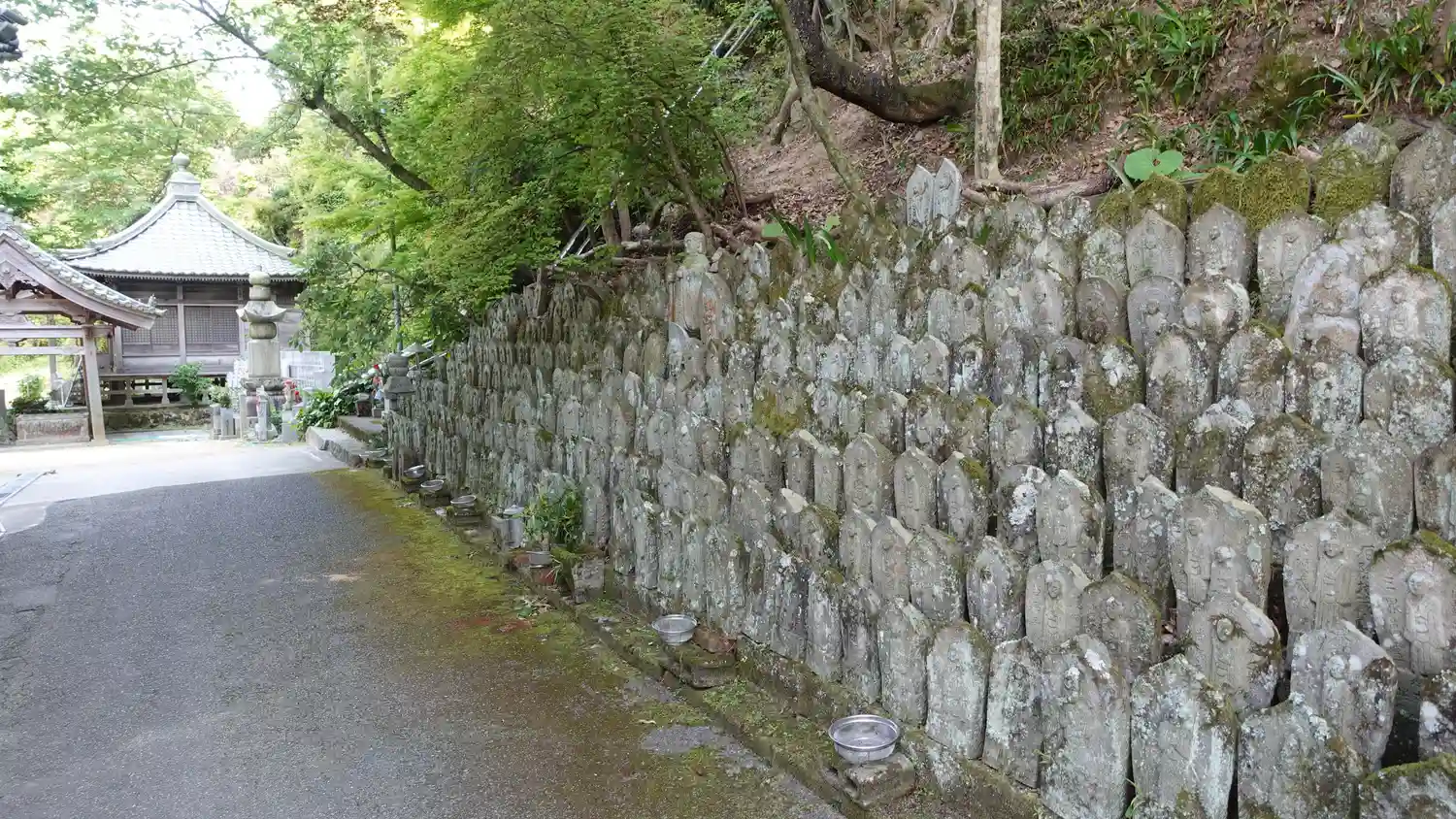 山門裏から本堂へ向かう階段が伸び、石仏が…
