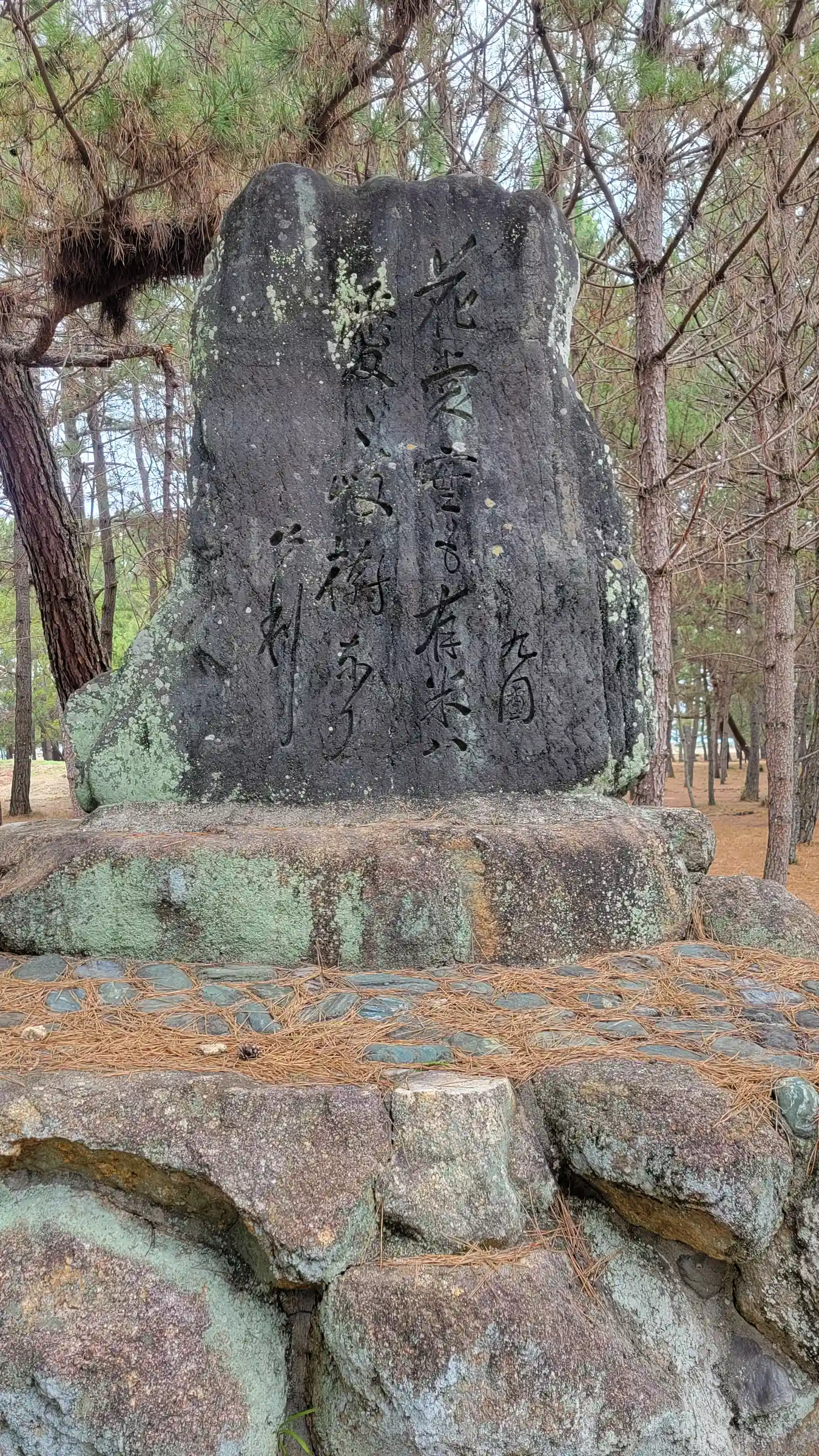 この神社の東の参道の近く、海岸沿いを東に歩くと大きな岩と松があります。嵐によって流されて漂着した道真公が冠や装束をこの岩に置いて干したという伝承があります。