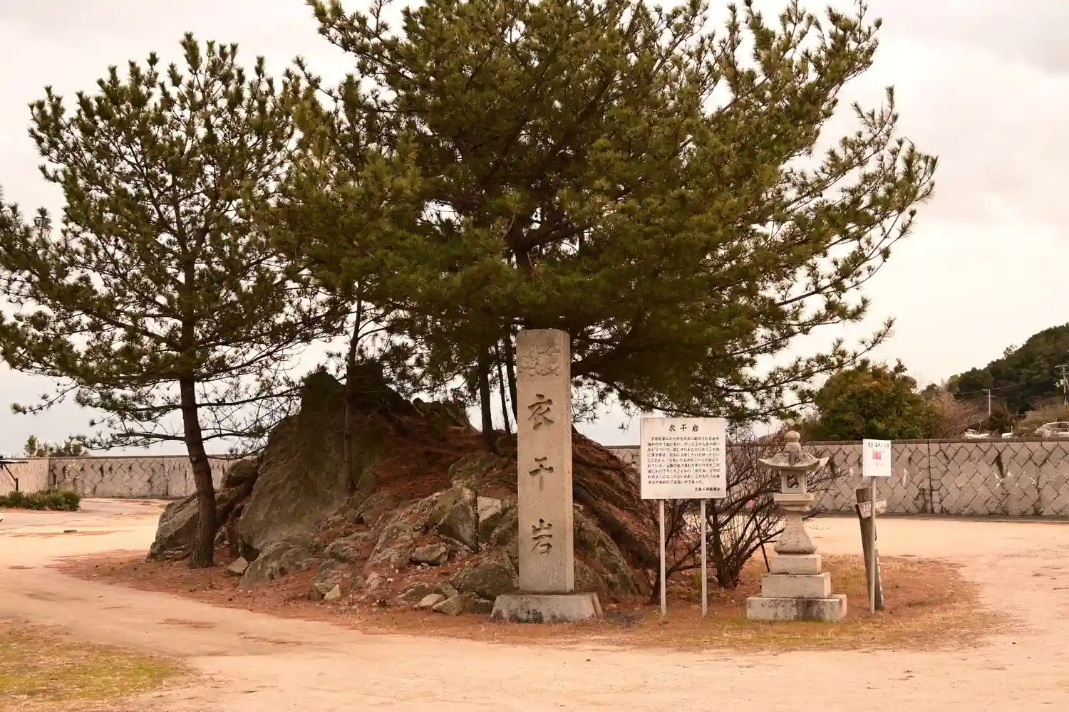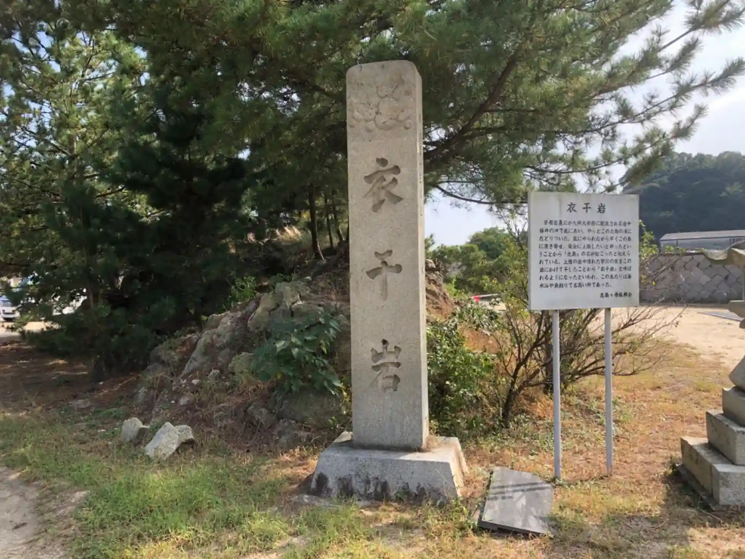 この神社の東の参道の近く、海岸沿いを東に歩くと大きな岩と松があります。嵐によって流されて漂着した道真公が冠や装束をこの岩に置いて干したという伝承があります。