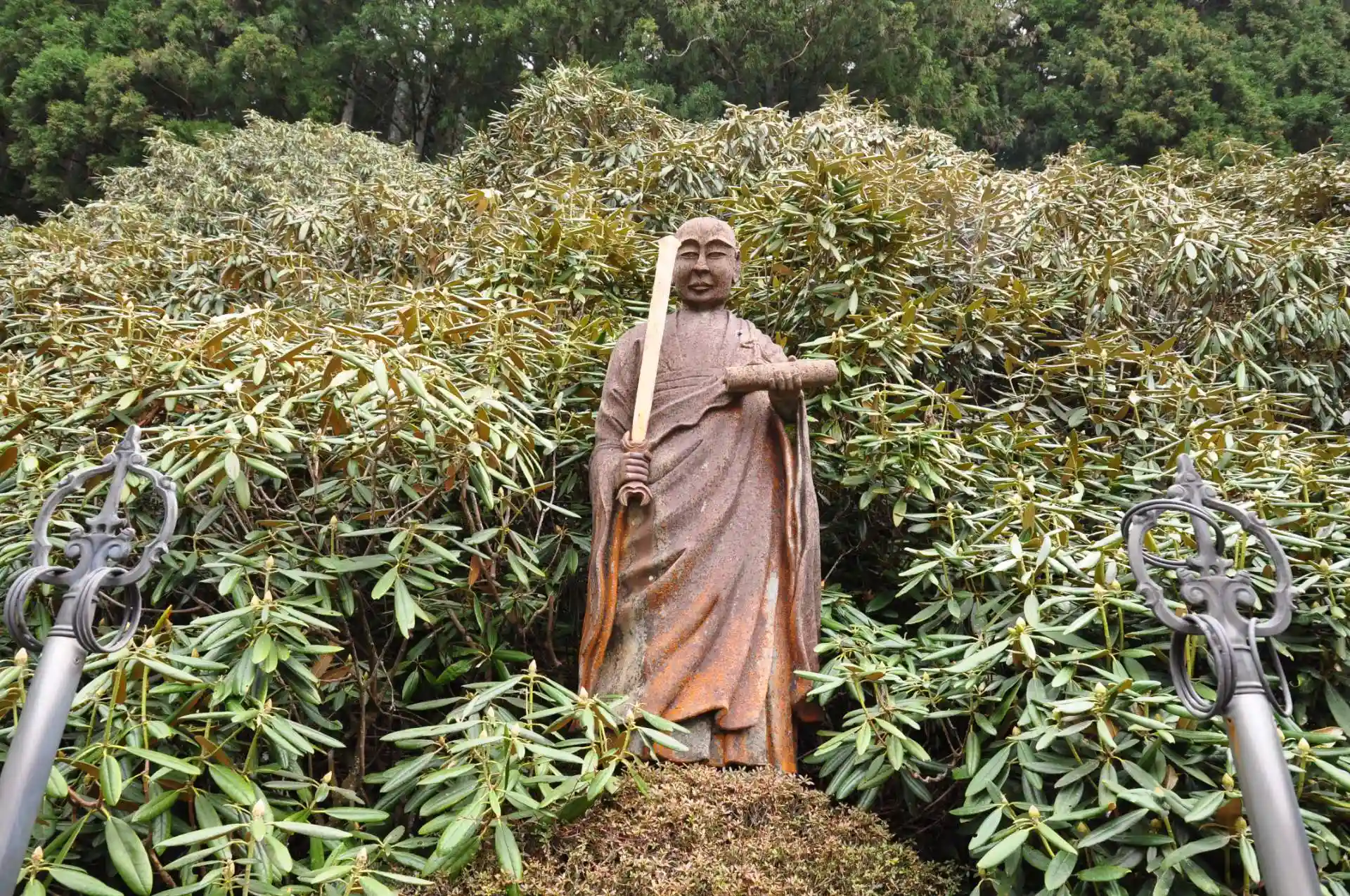 四国の霊峰石鎚山の標高750m付近に位置する寺。本堂から大師堂の脇一面に植えている石楠花(しゃくなげ)は、5月上旬頃から鮮やかに咲き誇る。(四国霊場開創1200年記念絵はがき)