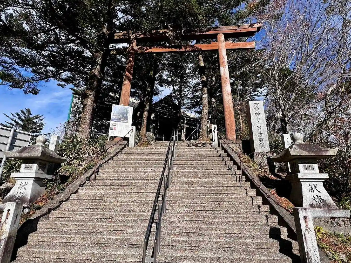 御社殿は改修中で足場が組まれてました。