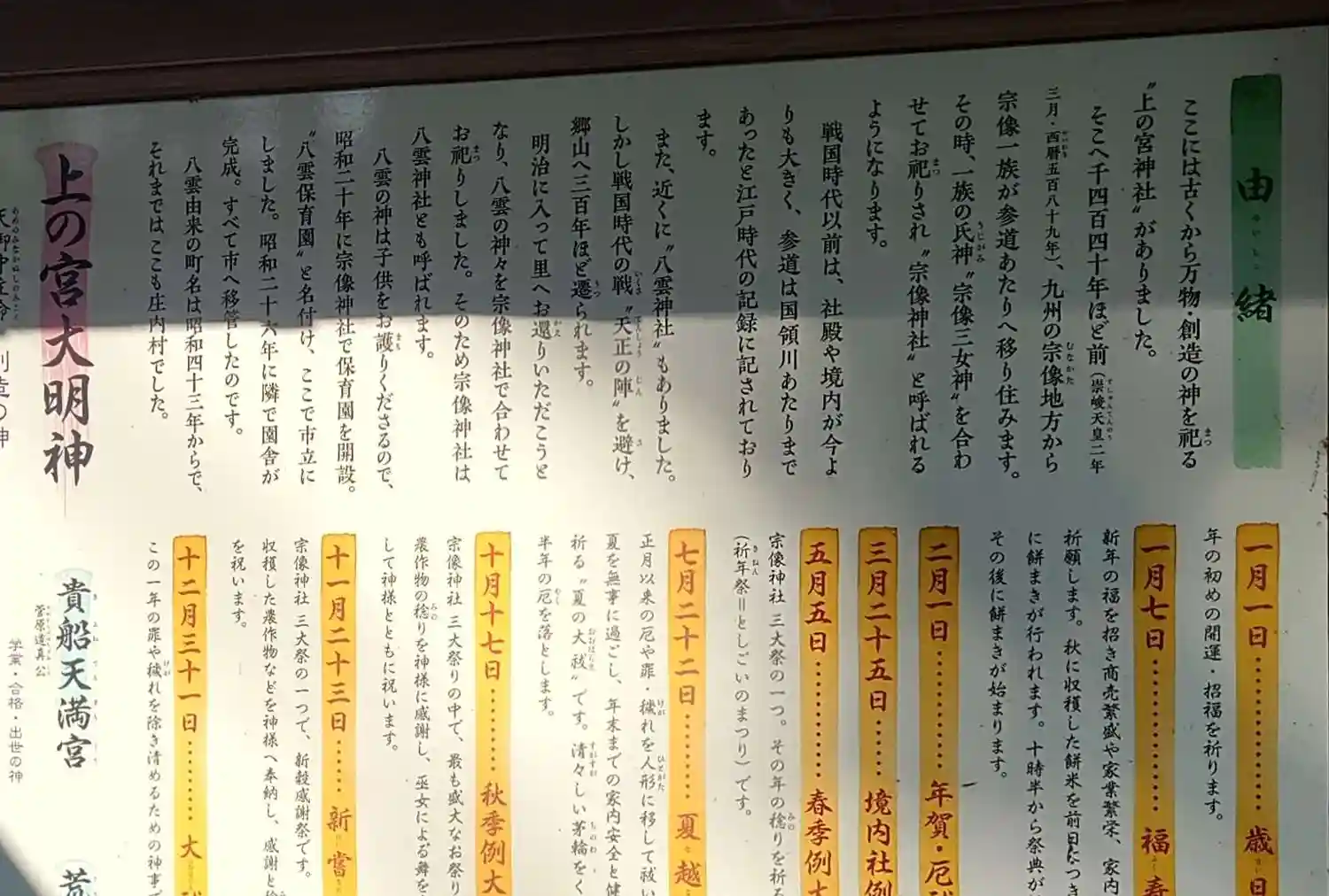 | ご由緒 | 飛鳥時代に伊予の豪族越智氏が後の新居庄の中心である庄内庄治の地に、饒速日命、天道姫命、鹿屋野姫命を祀る上の神を奉斎したが、その後、恒武天皇の延暦年間に筑紫の豪族宗像氏が、宗像三神と八幡神を奉じて上の宮境内に宗像神社を創建し、庄内、田所、平形、東雲の氏神として崇敬し、明治5年に郷山岡崎鎮座の八雲神社を合祀した。