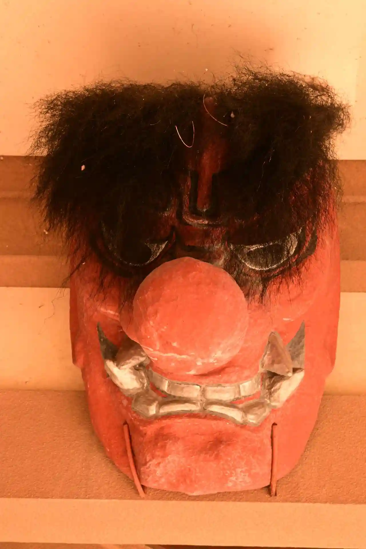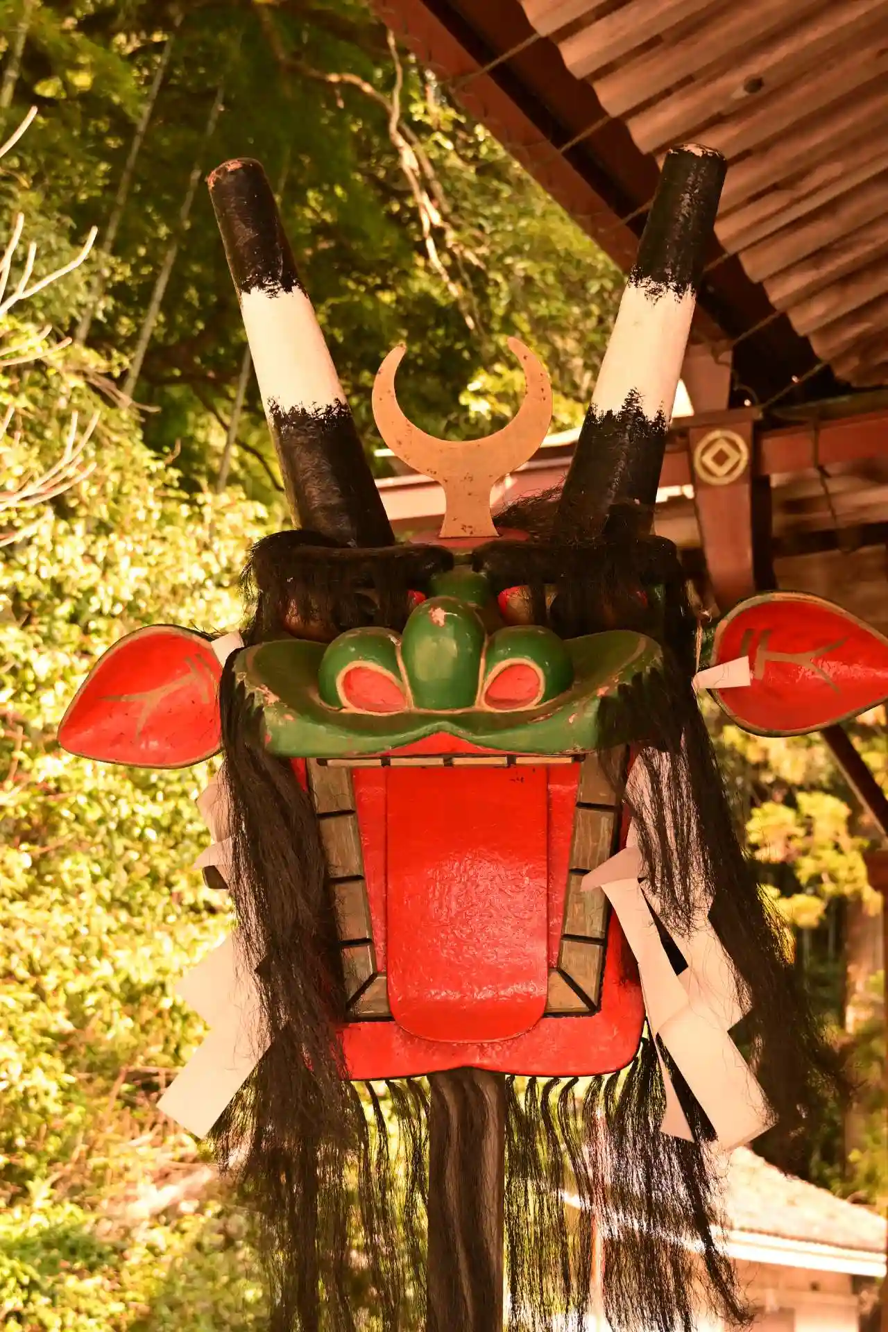 口は獅子舞のように大きく開くようになっており、首を傾けるたびにパカパカします。頭の角には榊と大きな木札が取り付けられています。