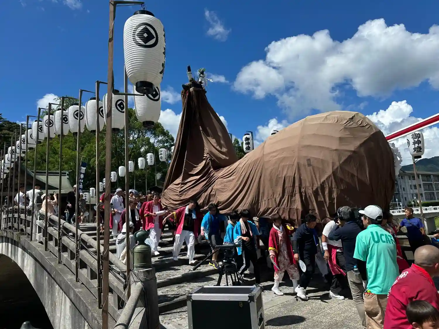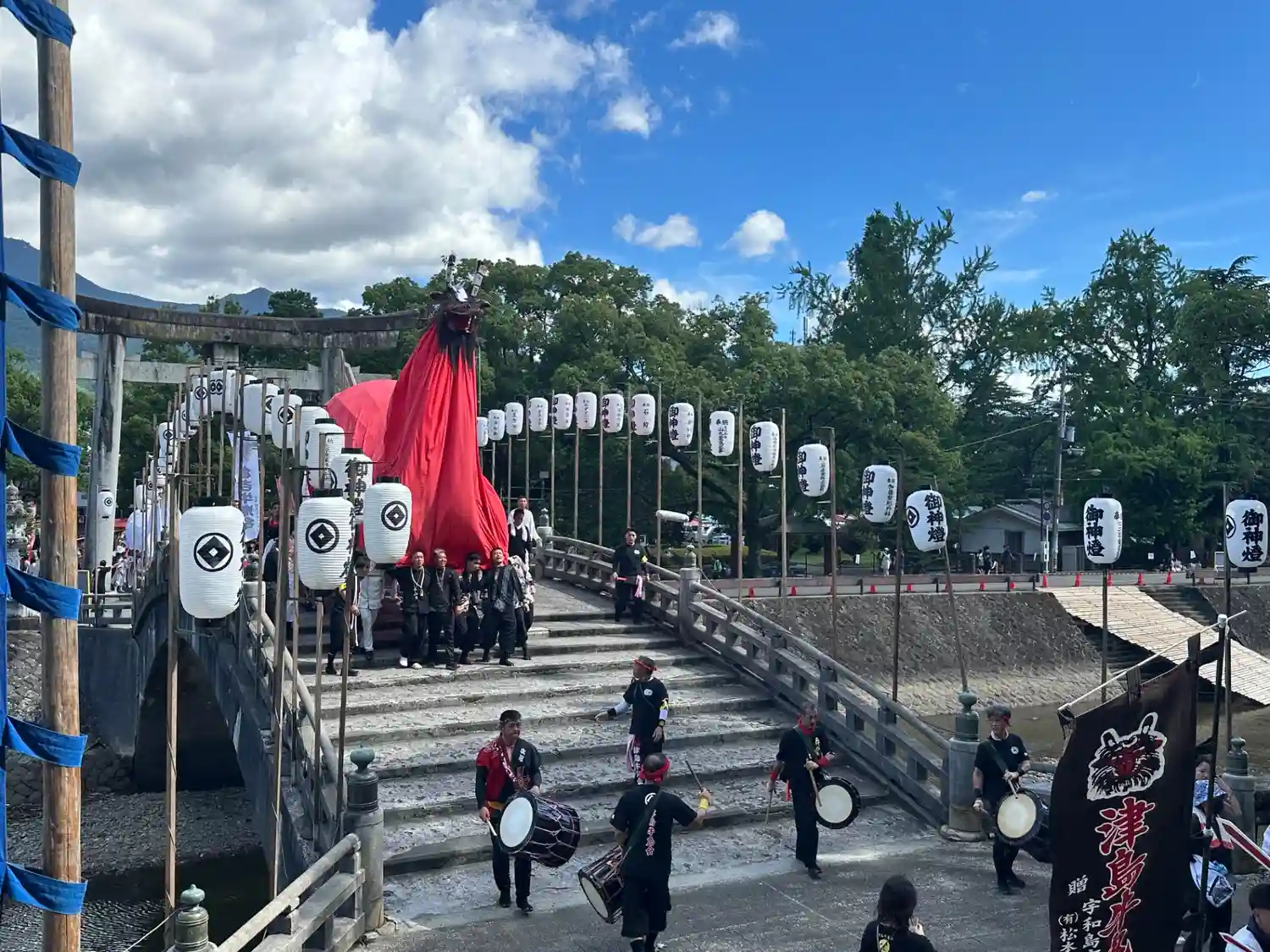 太鼓橋を渡って神門前で"練り"を行う牛鬼と渡らない牛鬼がいます。