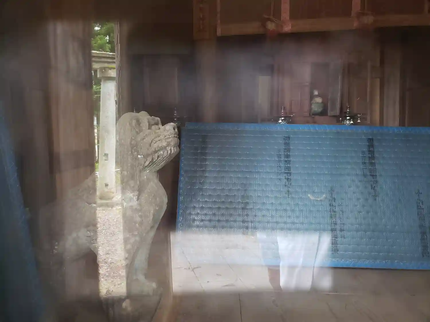 素材である笏谷石はもろい為、狛犬を護る為に堂内に現在は鎮座している様です。