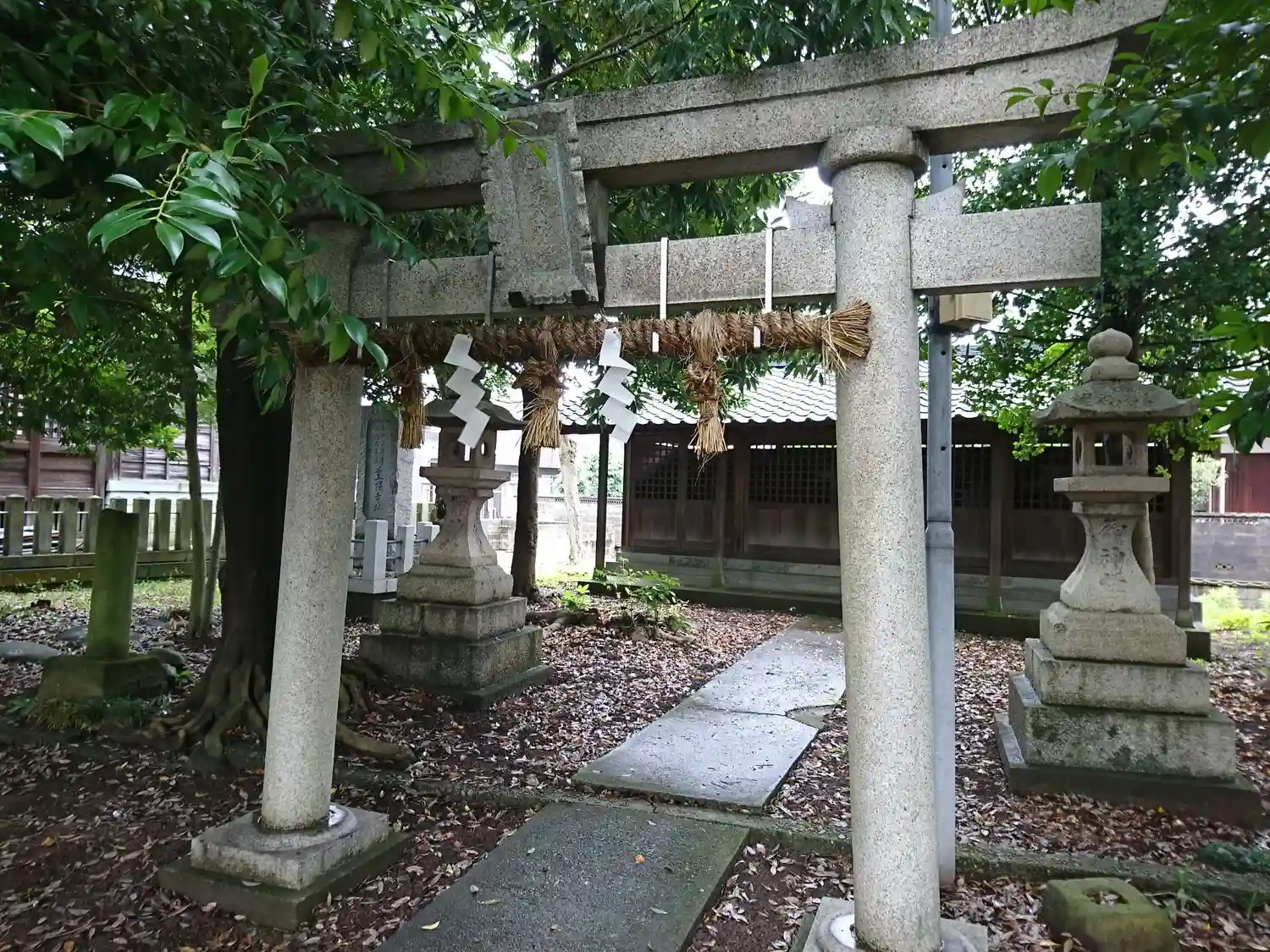 境内社の石祠を納めた建物が奥に見えます。