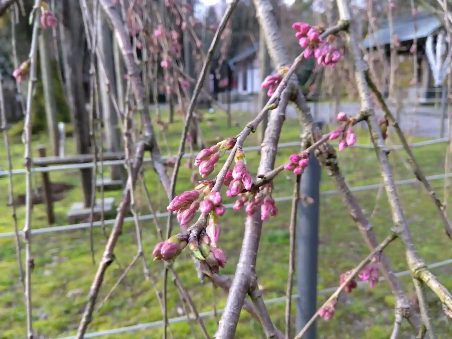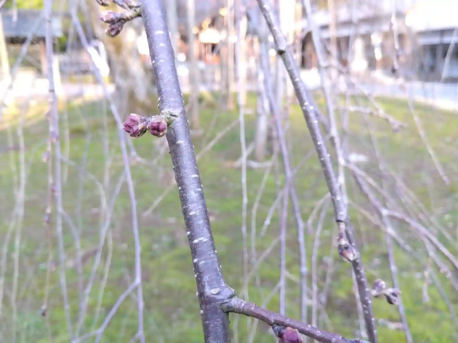枝垂れ桜のつぼみの先が濃いピンク色に🌸