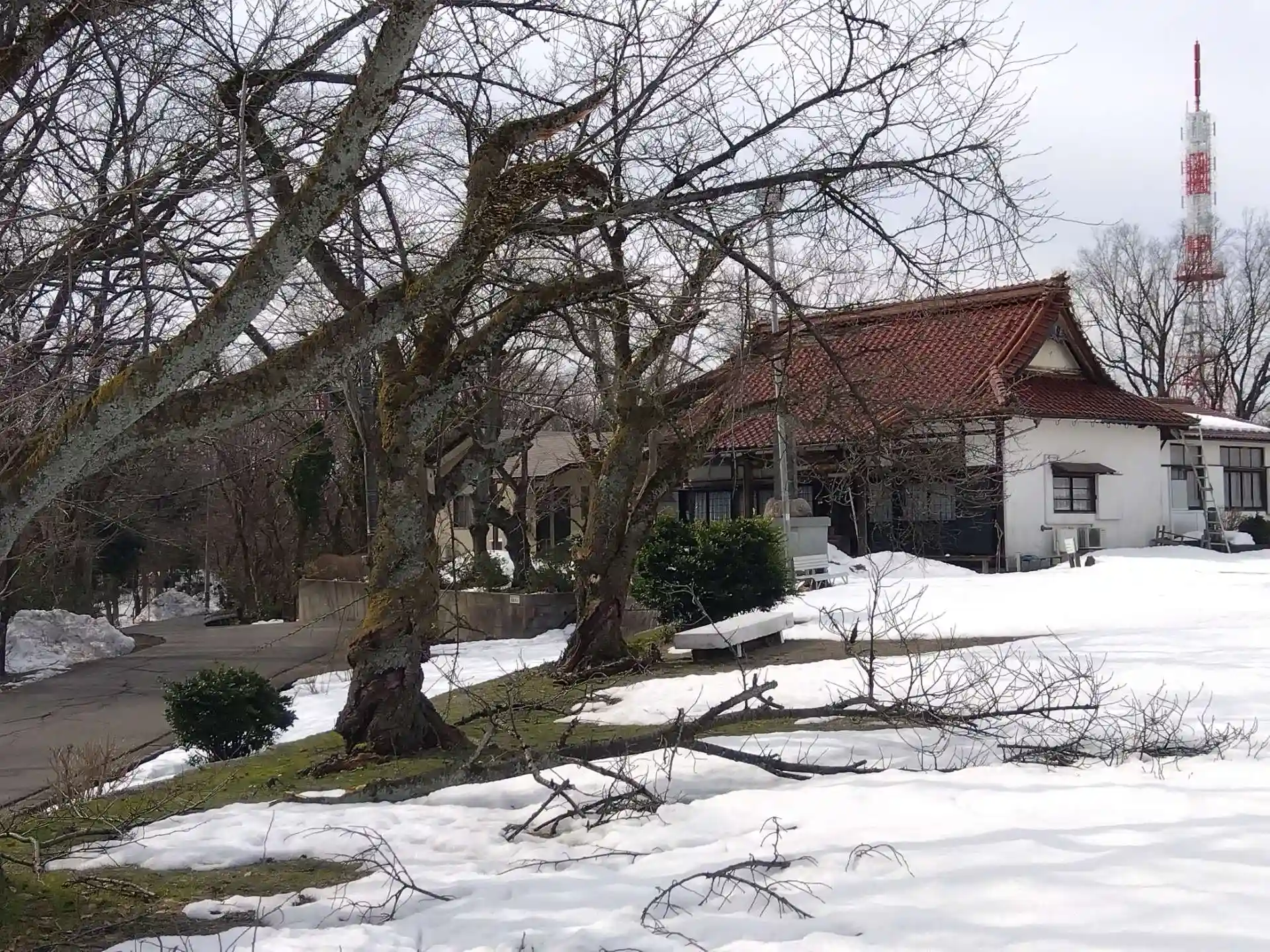 足羽山の妙法寺と平和塔(仏舎利塔)前でも、桜の枝折れがあります😣