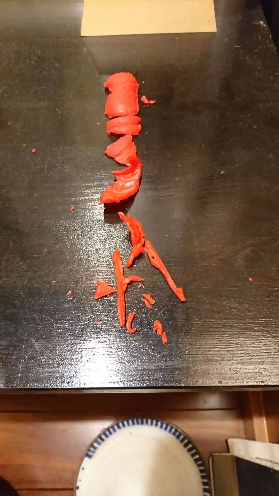 右側の赤い物は火をつけたろうそくの溶けた物です。