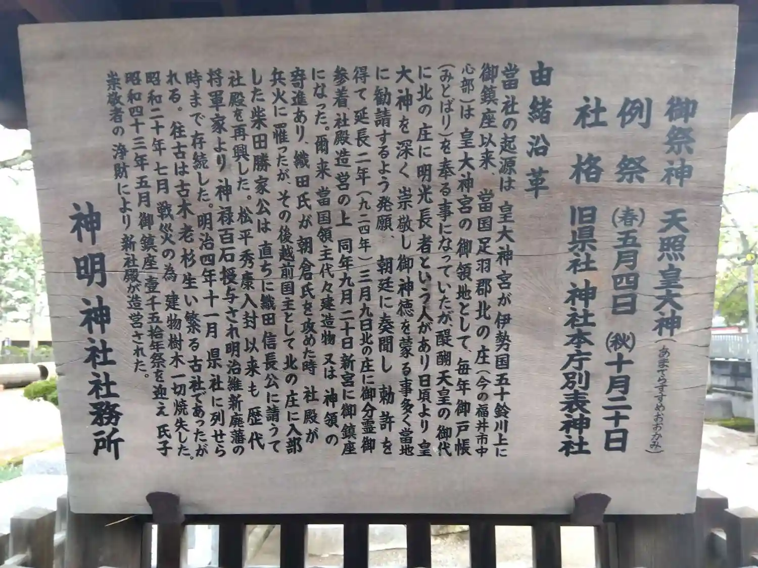 醍醐天皇の時代、内宮足羽御厨の北の庄の某が伊勢皇大神の勧請を願い出て勅許され、延長2年に神霊を足羽…