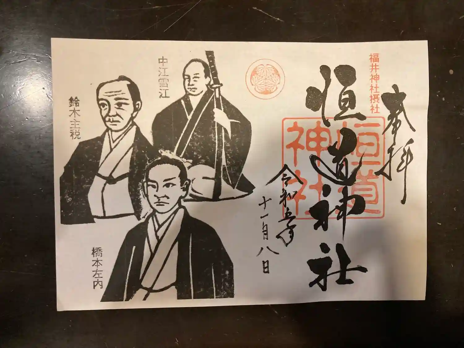 今回頂いた御朱印は橋本左内、中江雪江、鈴木主税の3志が描かれておりました。他にも数種類ありました。全て社務所でお分け頂けましたよ。