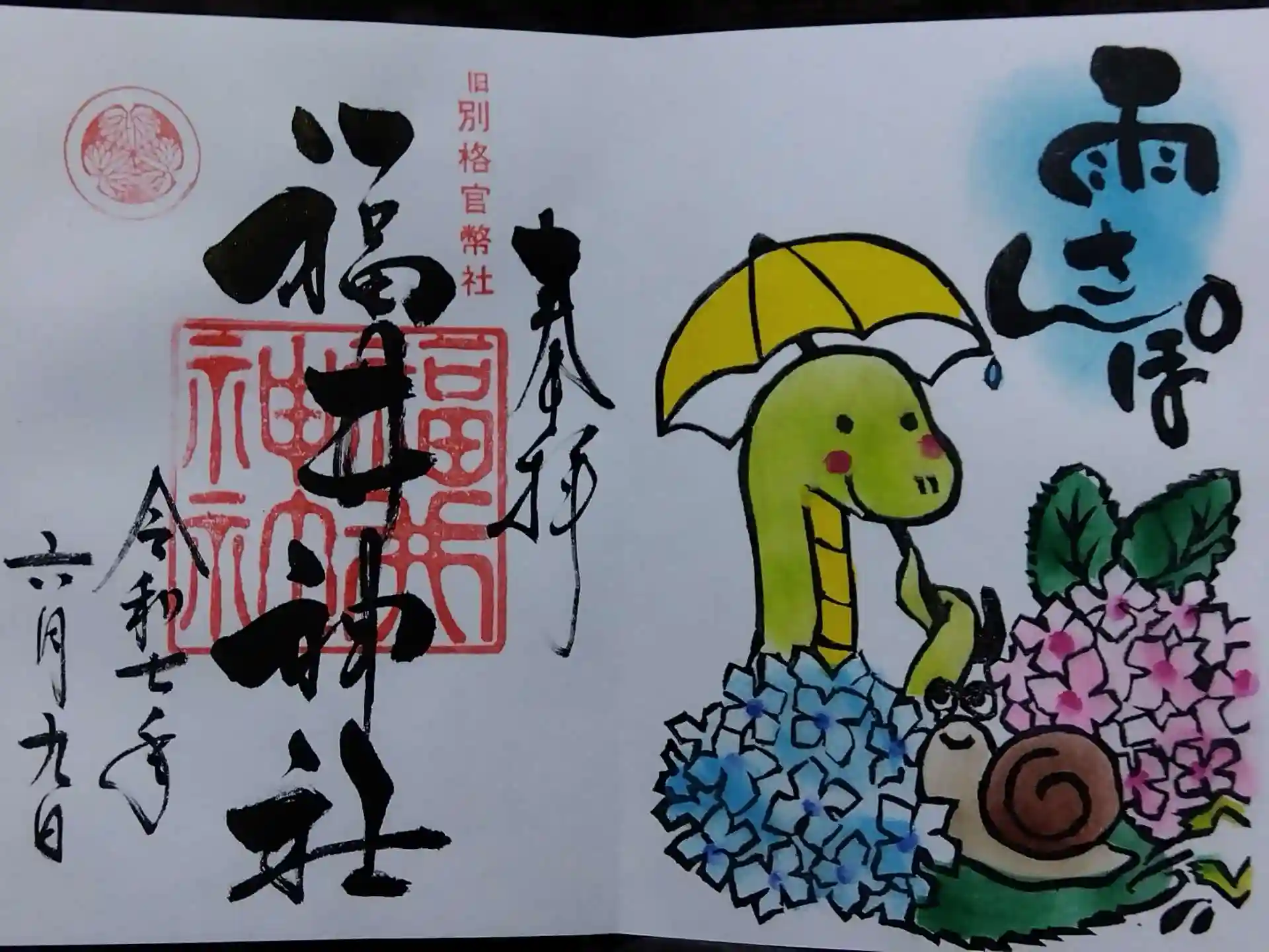 福井神社さんにて6月の月替わり御朱印から「🐍雨さんぽ🐌」をいただきました🖌️