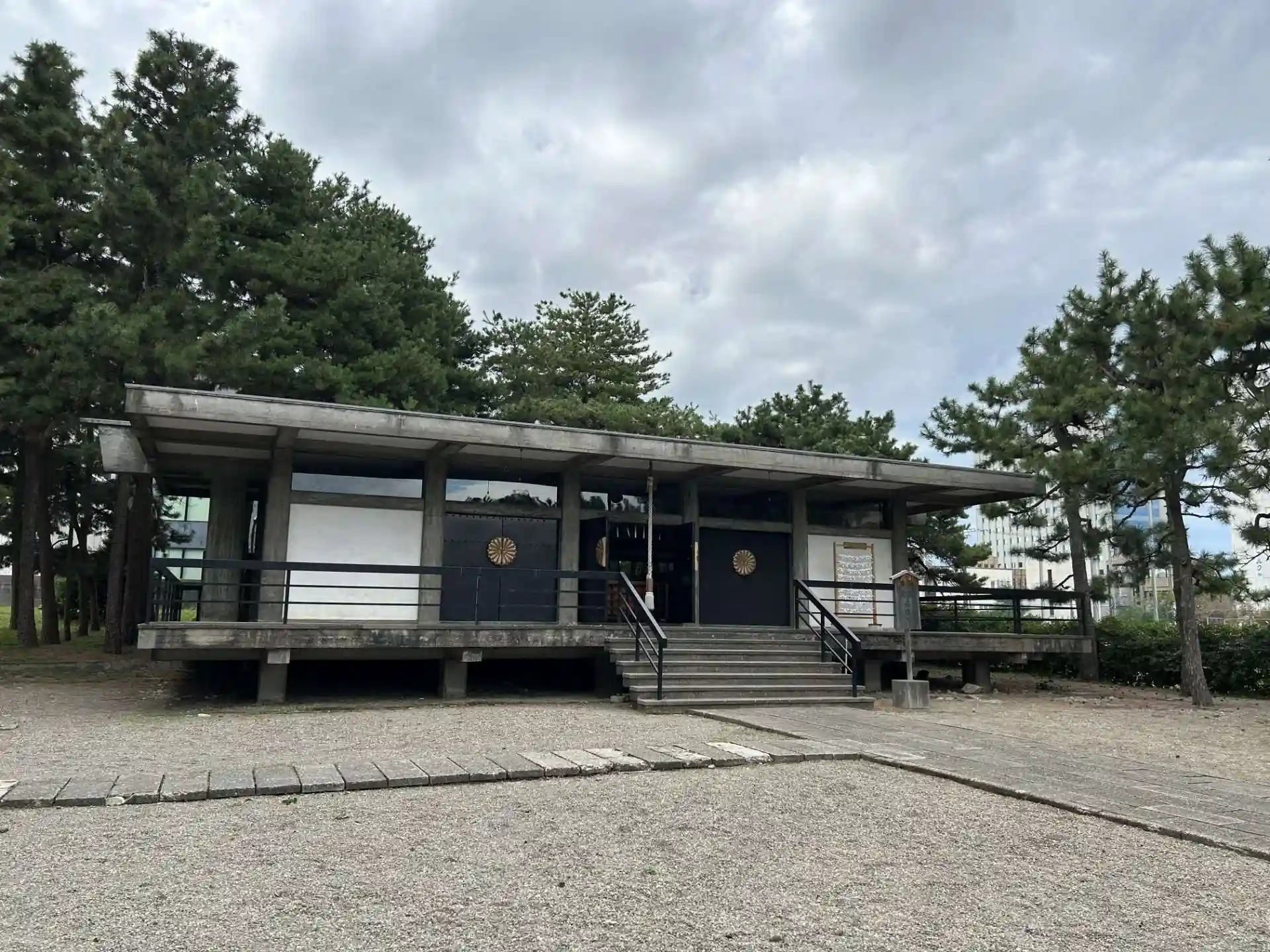 福井藩16代の藩主で、福井藩の藩政改革を行い、明治維新の際には徳川親藩・譜代大名の尊王派の中心人物となった松平慶永(松平春嶽)を祀る神社として、昭和18年に創建。日本最後の別格官幣社。昭和20年7月19日の福井空襲で焼失した。昭和32年、福井大学工学部の五十嵐直雄の設計により再建。総コンクリート造りで、表面はコンクリート打ち放し、神明造を大幅に変形した傾斜の無いフラットな屋根という、一般的な神社とは大きく異なる独特のモダニズム様式で全ての建物が統一されている。