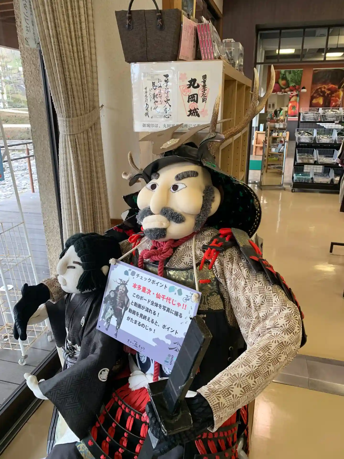 駐車場隣にある一筆啓上茶屋にいた、戦国武将人形、後ろに御城印2種の見本があります。