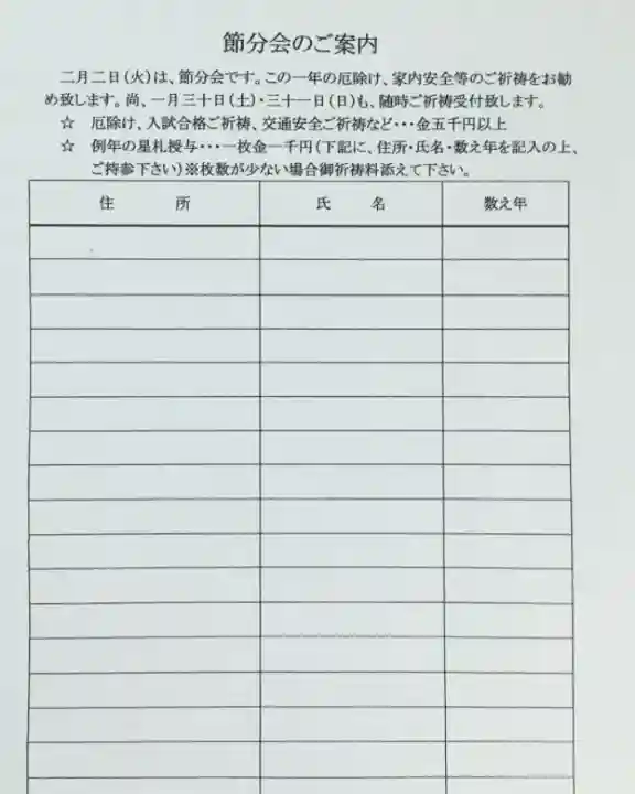 令和三年の節分のご案内です。今年は2/2が節分です。節分当日はもちろんのこと前後の週末など希望に合わせてどんな日程でも受け付けています。事前連絡があるとお札を用意できるのでスムーズです。