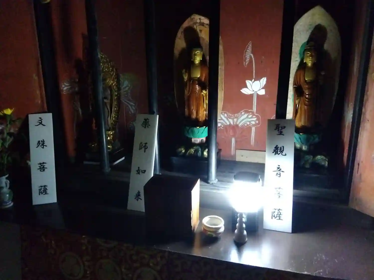 右側に聖観音・中央は薬師如来・左は文殊菩薩