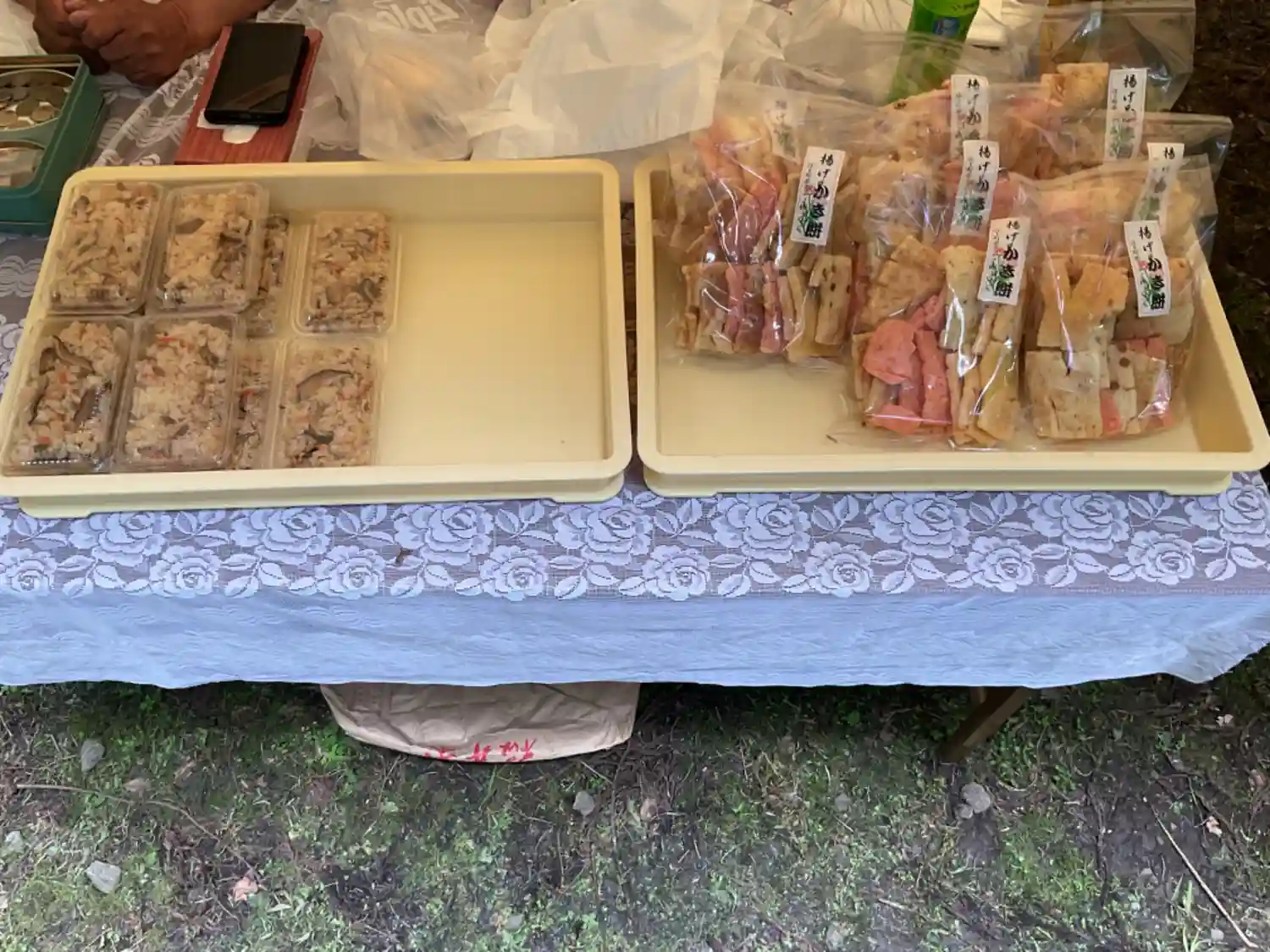 かき餅と五目ご飯(キノコ類が多くて美味しかった)が販売されていました。