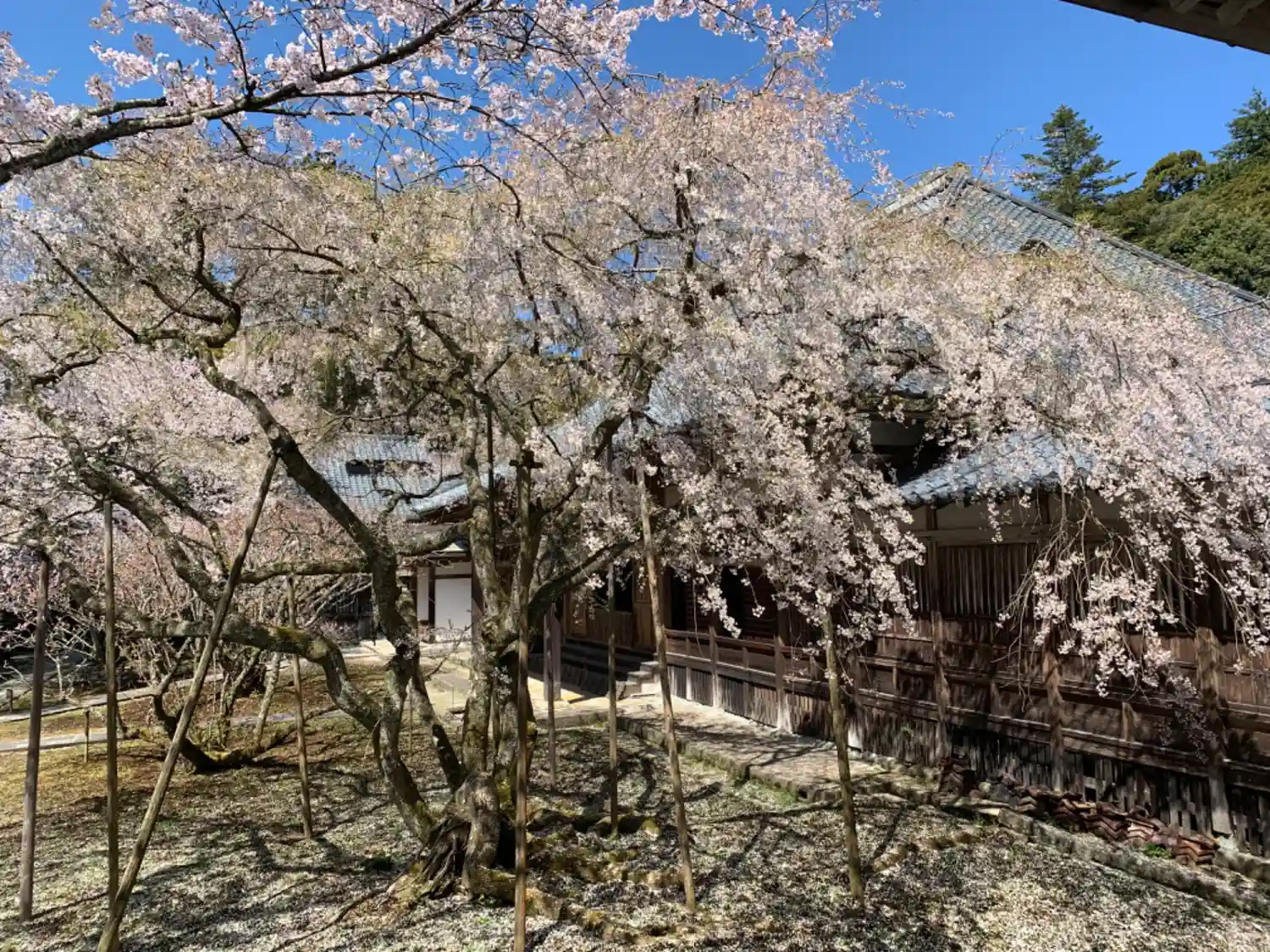 本堂前には梅の木、そして周りには大木の桜の木があります。