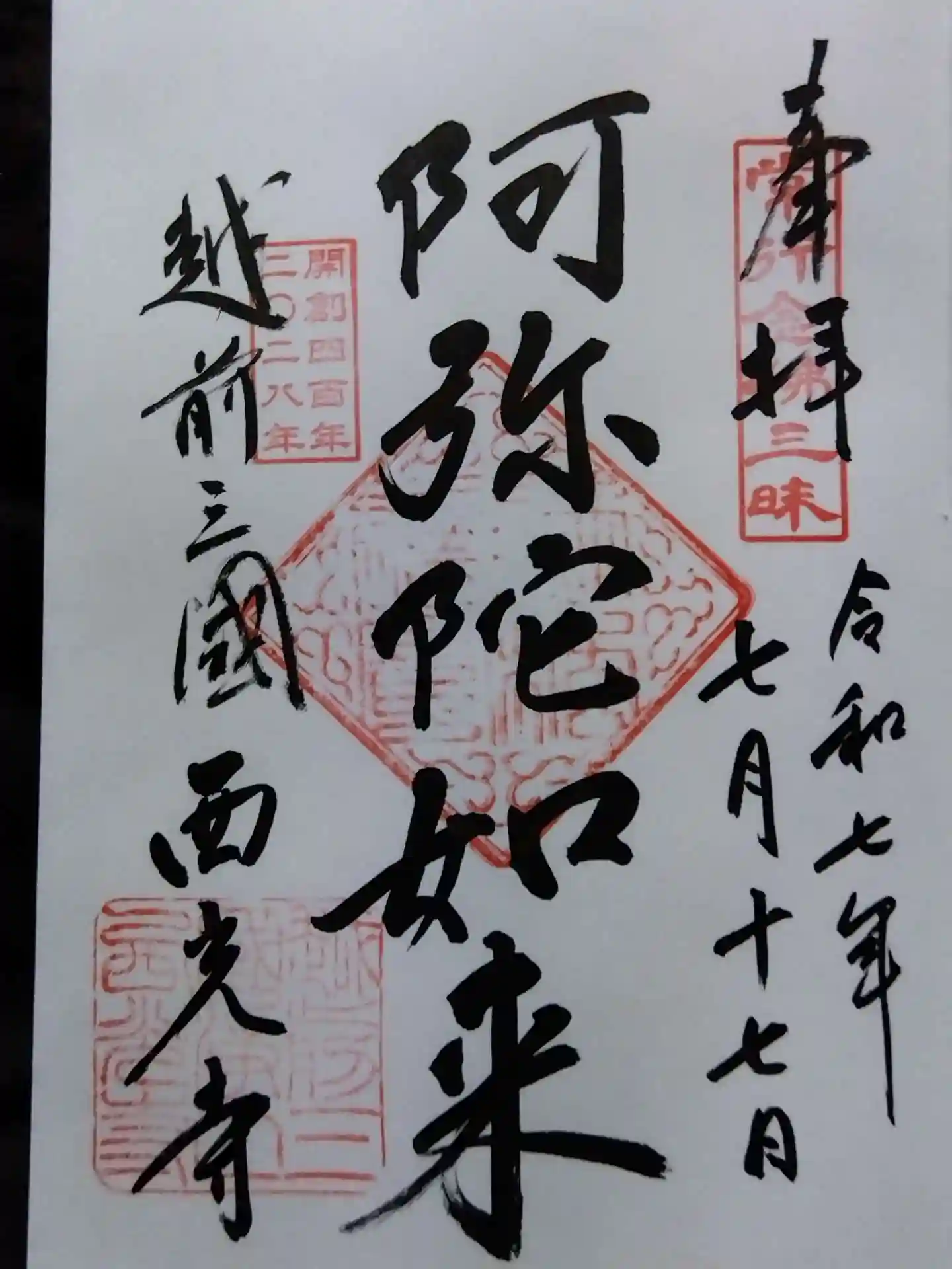 HPに御朱印の案内があり、御本尊の直書きをいただきました(松平春嶽や遊女・三国小女郎のもあるようです)🖌️汗だくにて失礼いたしました🙇