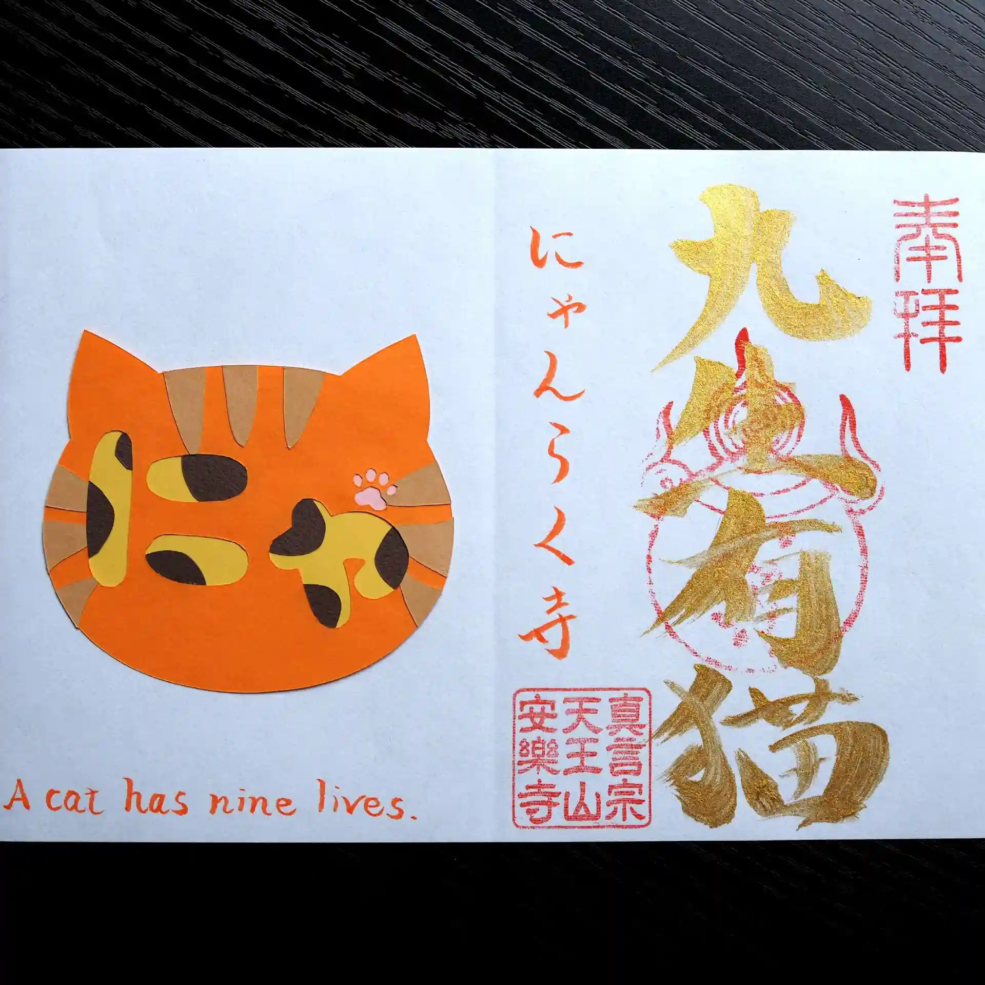 お問い合わせいただいていますが、この御朱印は「おまかせ頒布品」になりますので、猫ちゃんや「にゃ」の切り抜き部分がどのような色・柄になるかは、お手元に届くまでのお楽しみ♥となります