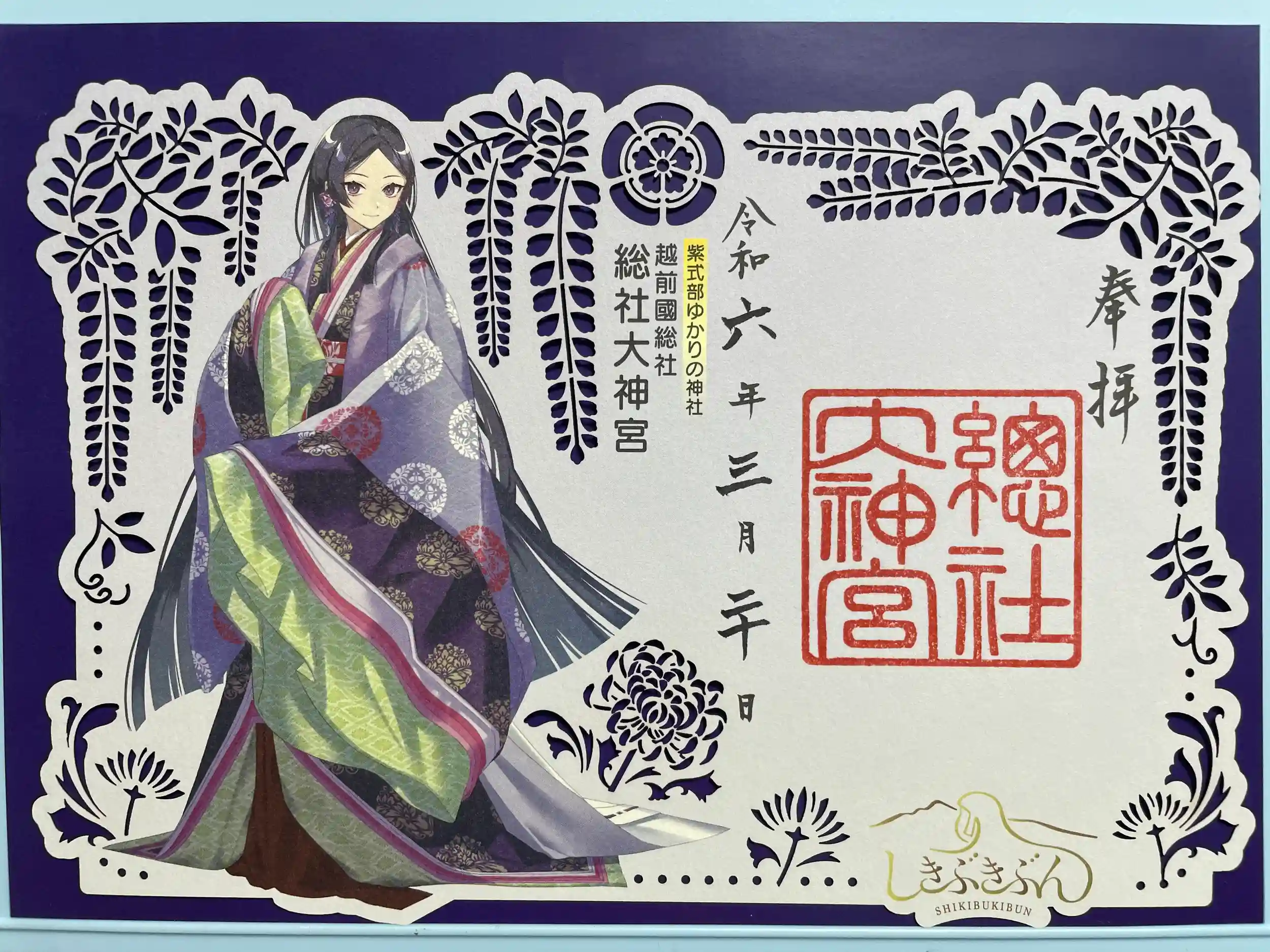 紫式部ゆかりの神社ということで 御朱印も 切り絵の御朱印頂きました