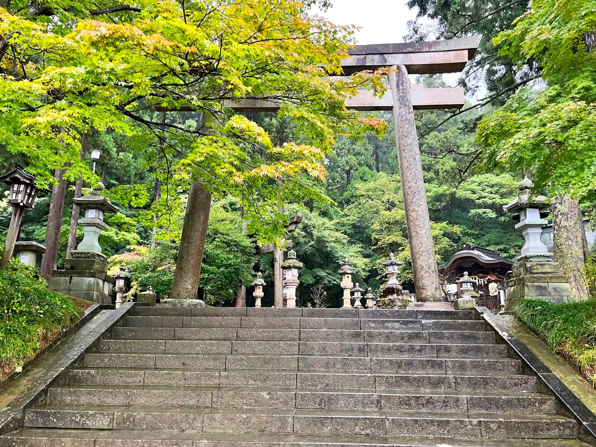 神域全景。拝殿と本殿で高低差が数十mある、独特な様式が面白い。