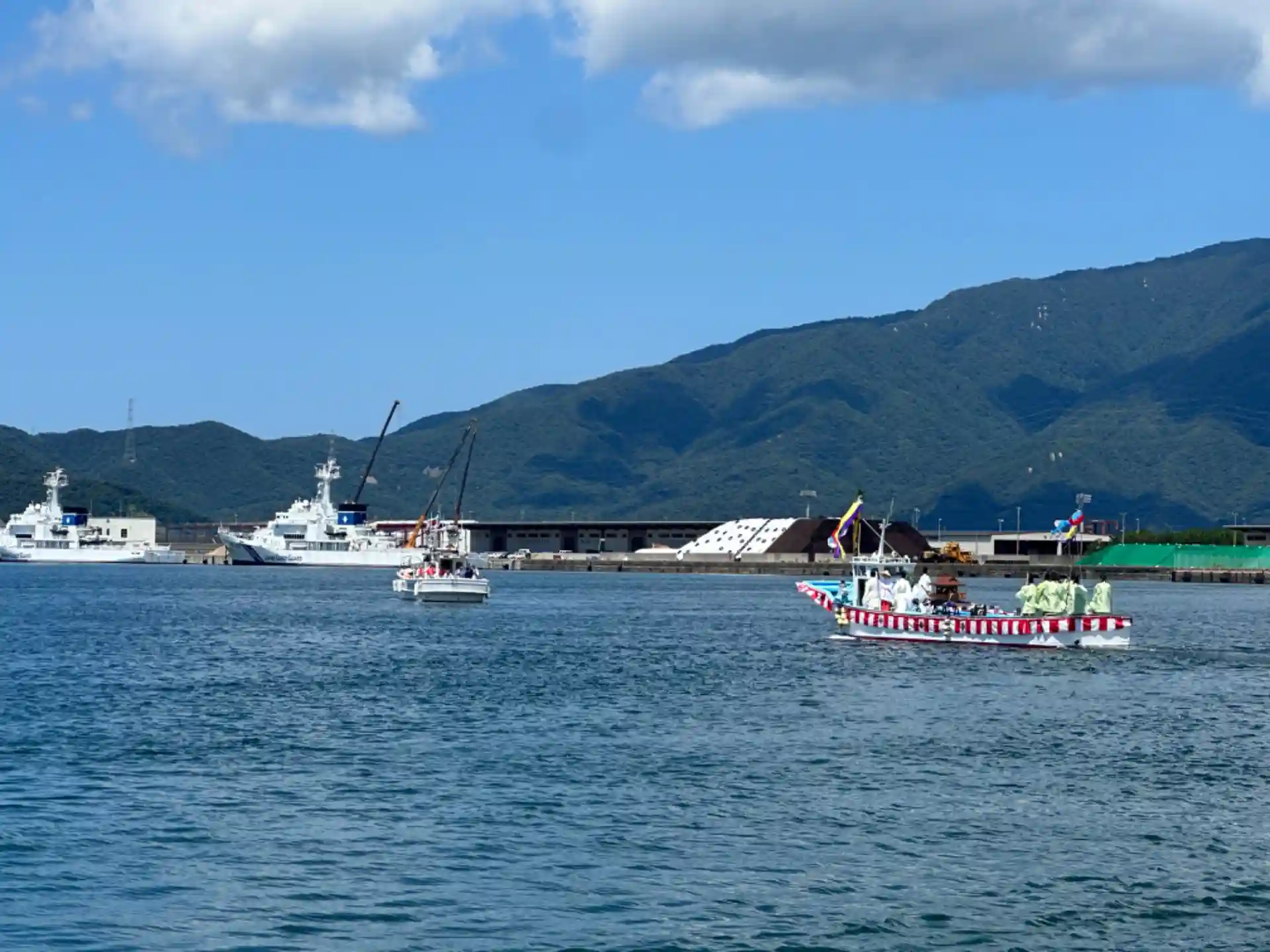 大体20分くらいで到着しました。吹き流しの掲げられた船に乗せられます。