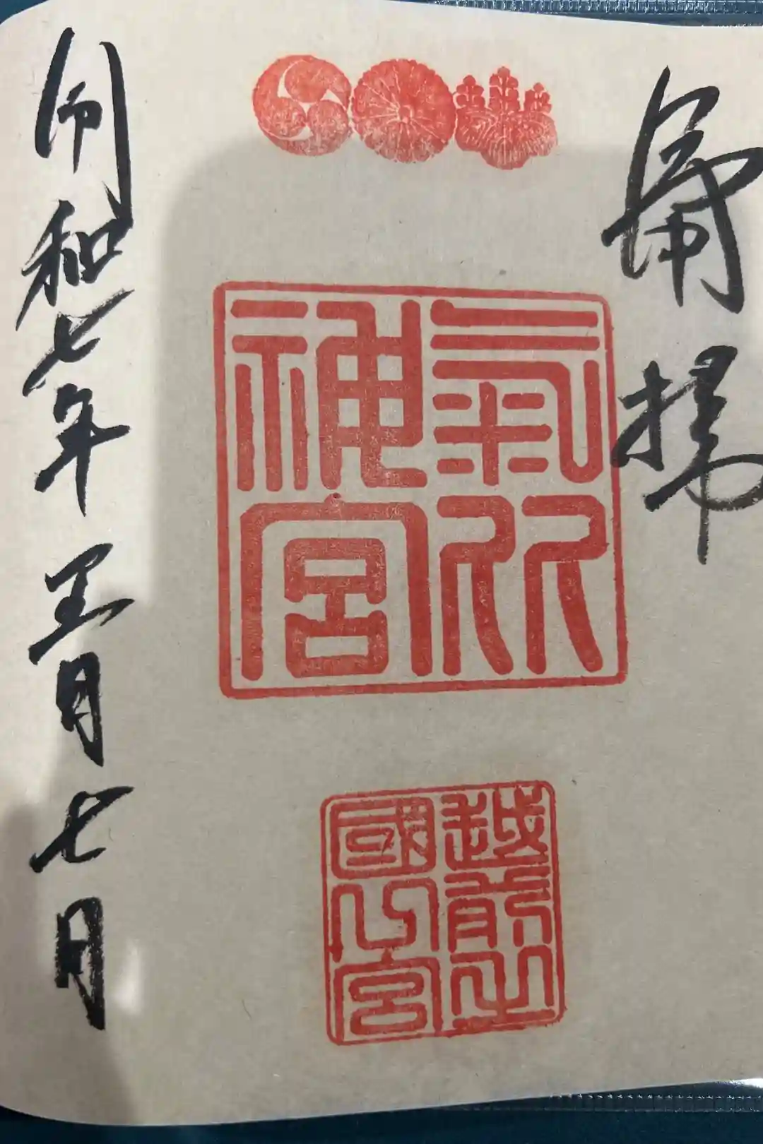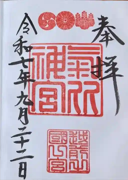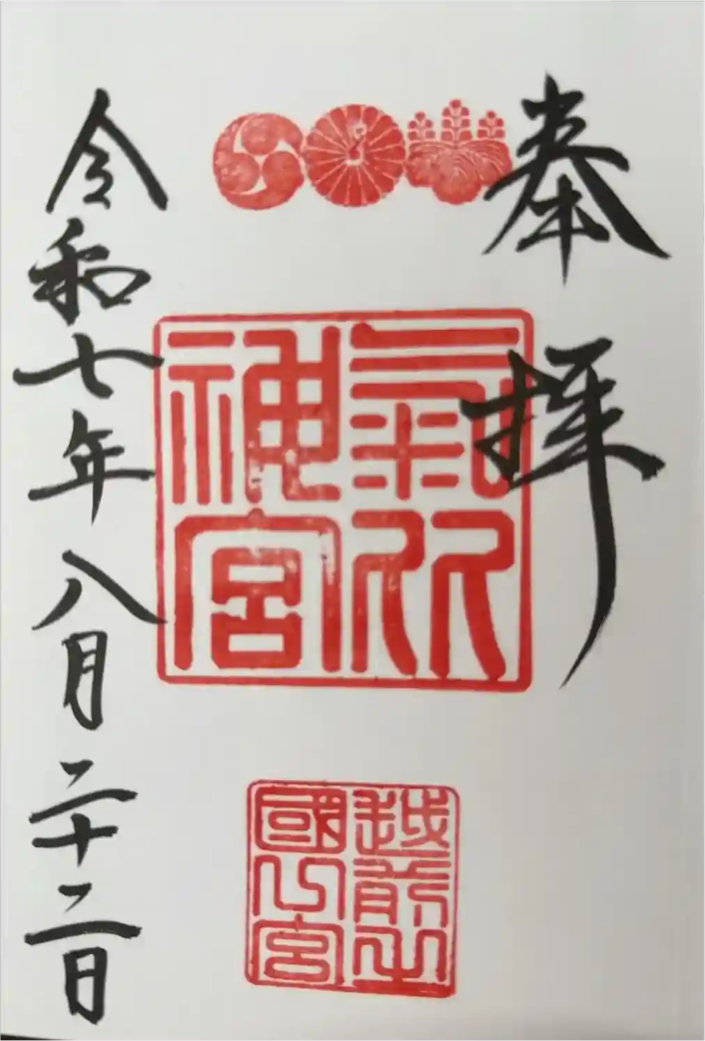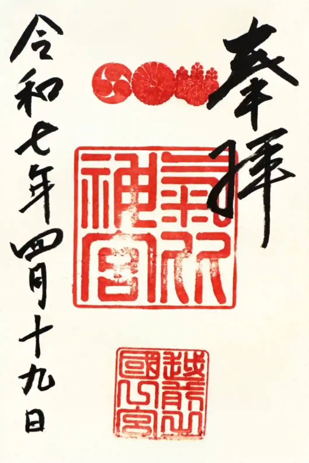 真ん中に御神紋三つ(五七の桐紋・菊紋・三つ巴)が押され、その下に神社印と「越前之國一宮」印が押されています。