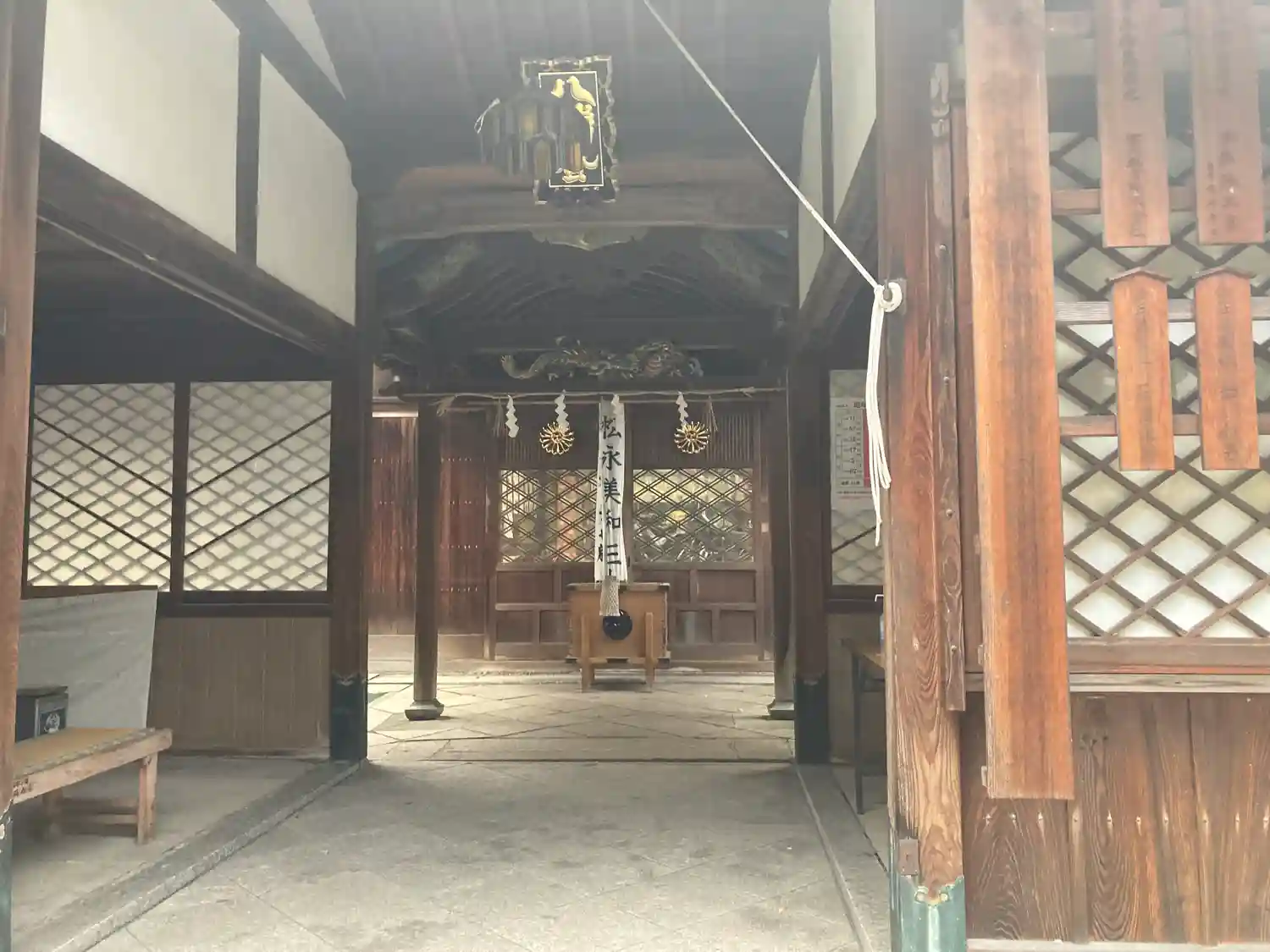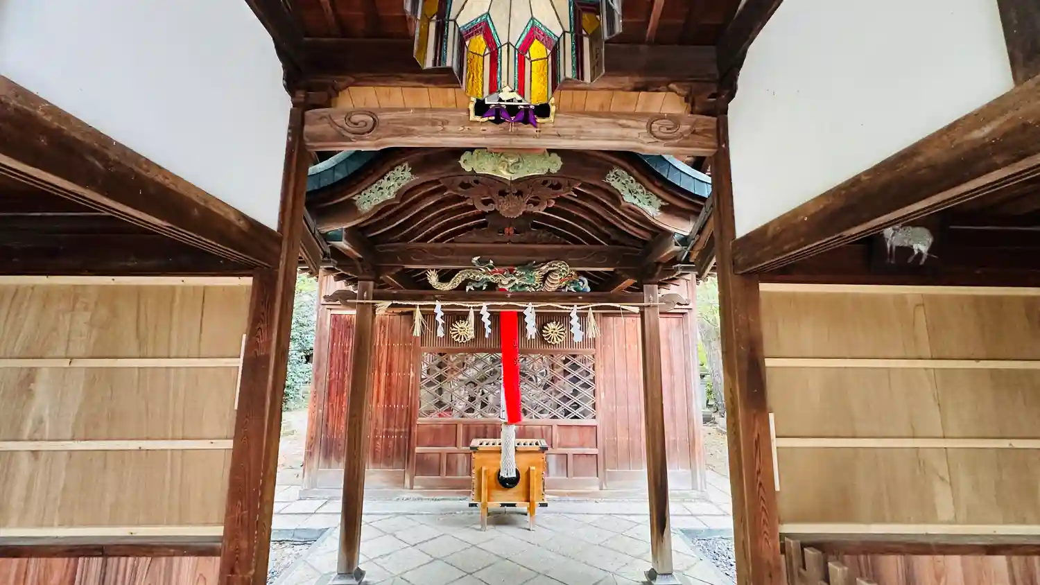 <中門>内部。「八幡宮」と刻まれた扁額。ステンドグラスの電灯がハイカラでおしゃれ。(o^―^o)