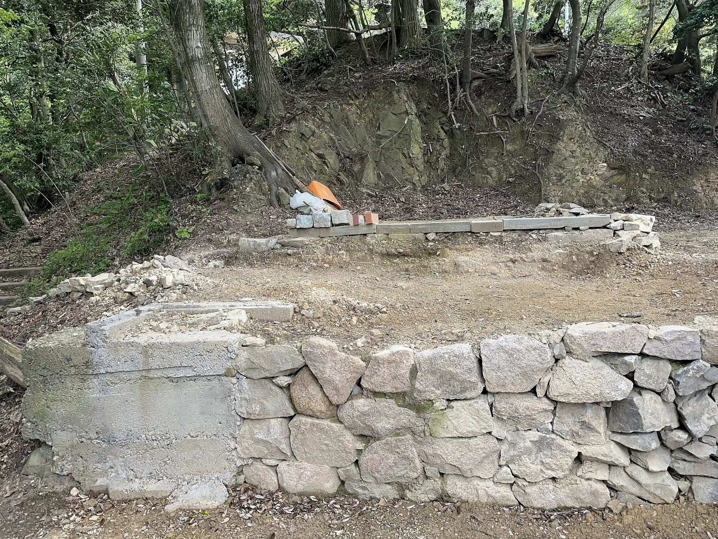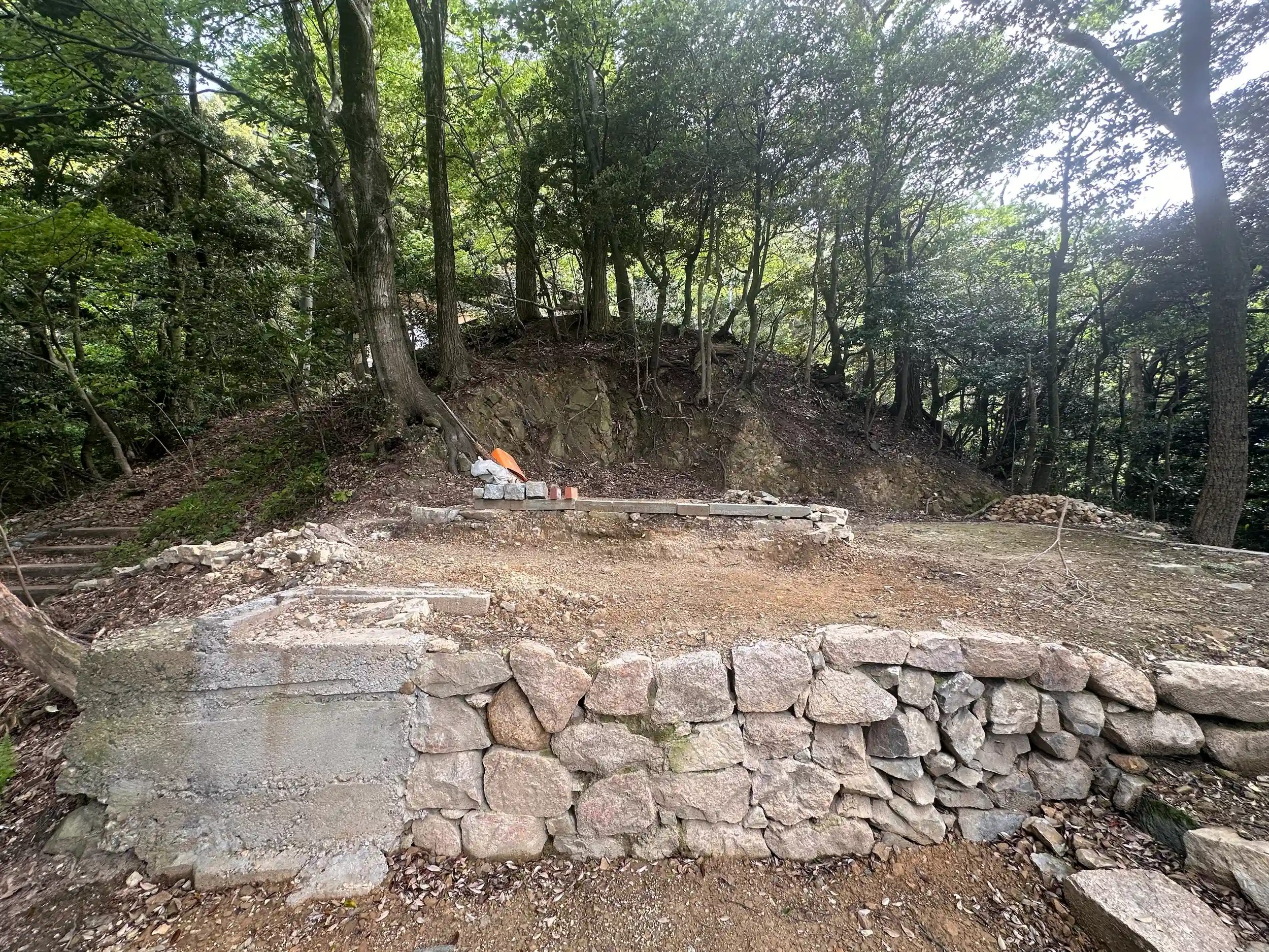ハイキングコースを登ること20分、あたりを探しましたが見当たらず、地元のハイカーの方に聞くと もう取り壊されて何も残っていないとのことでした、跡地に来てみると、赤い鳥居の後、大権現の大石や本殿への階段が残っていました、創建百数十年、世話役の方がいなくなり止む終えず廃社、解体となったようです、このような事がこれからも起こりうることなのでしょうか、悲しい気持ちで下山しました